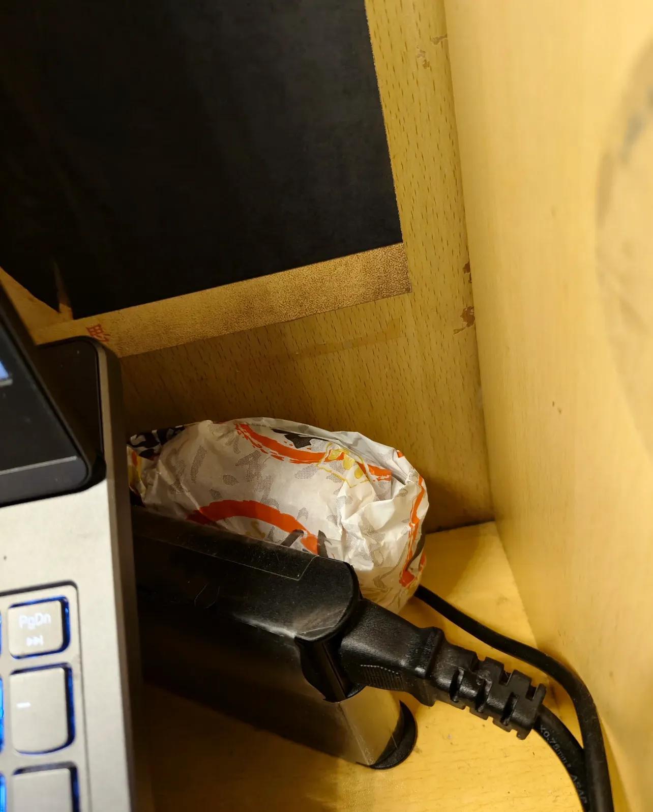 用電腦充電電源熱漢堡,不至於很熱,但低溫慢熱也能讓胃喫得舒服些。