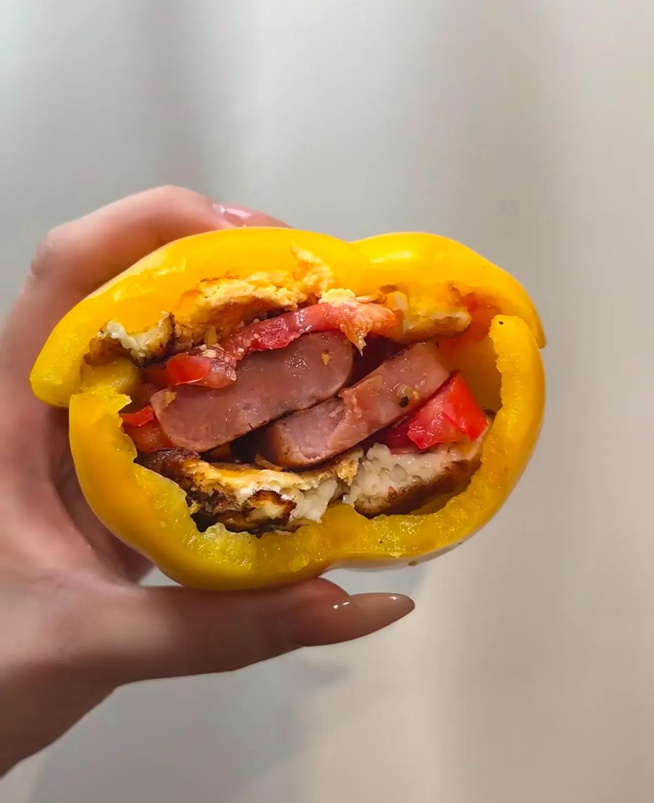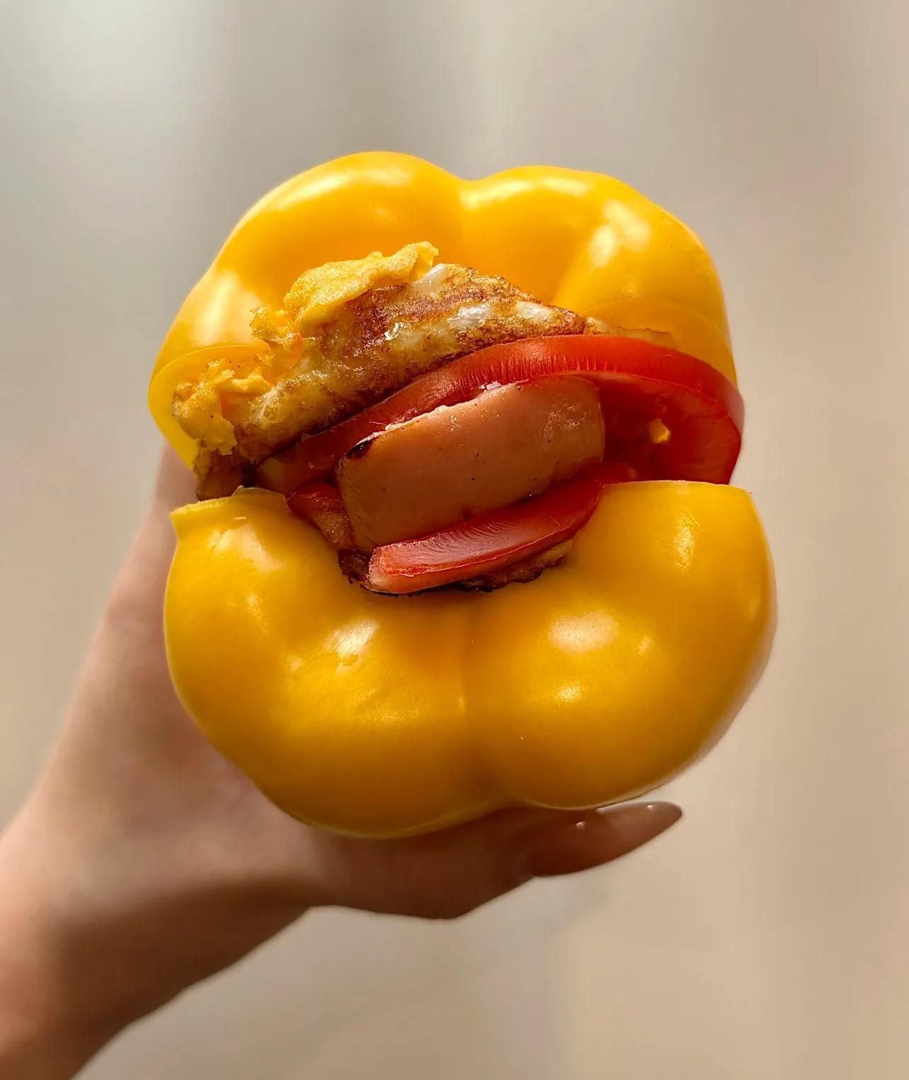 那就是,彩椒漢堡,彩椒的深度和厚度作爲容器就是天選漢堡胚,口味是甜脆的比較適口,維c含量高,熱量低,來看怎麼做: