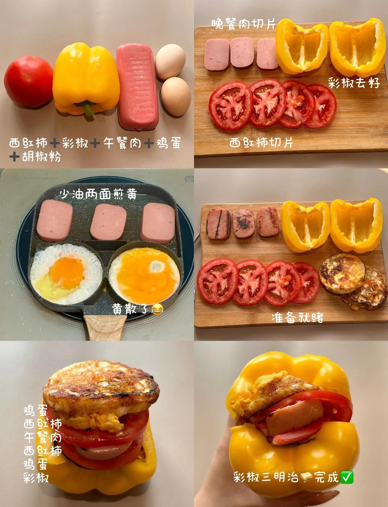準備食材:西紅柿、彩椒、午餐肉、雞蛋,可替換成自己喜歡的肉,還可以加生菜,放沙拉醬等喜歡的醬和調料。黃椒還可以換成紅椒,甜度稍微多一點。