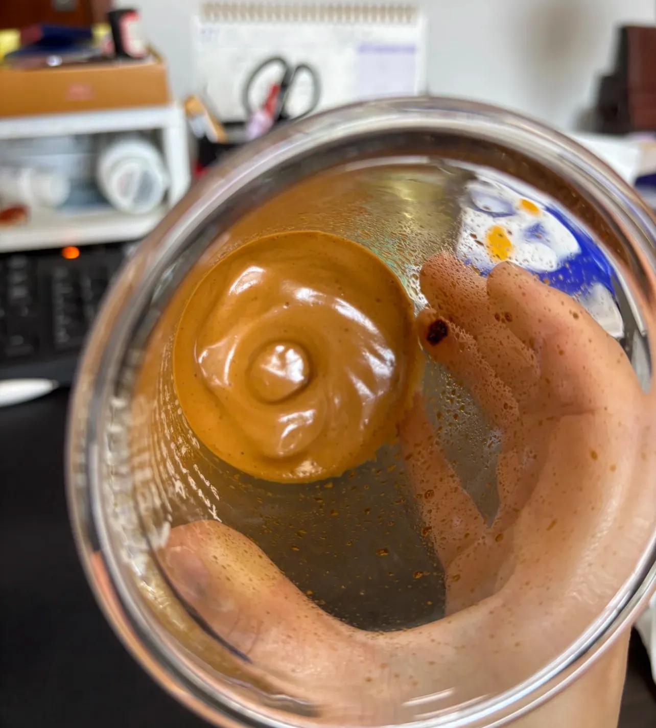 喝完的咖啡蓋子順着十字剪開一溜倒也行,重新蓋上作防濺,不過打泡器頭大的可能會卡住。