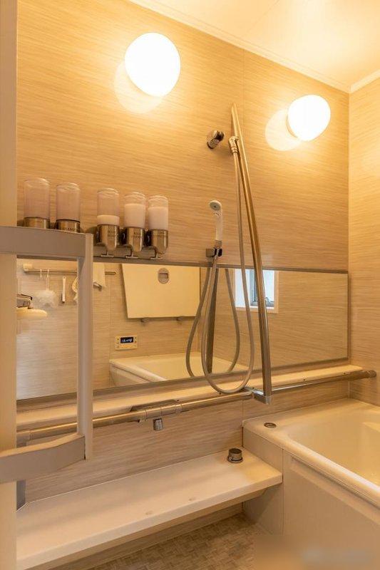 淋浴房設計也走心,花灑水流調得剛剛好,還能坐小板凳慢慢洗。