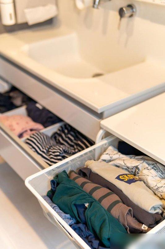 洗衣機烘乾機疊放省地兒,旁邊塞收納籃,孩子衣服烘完直接收抽屜。