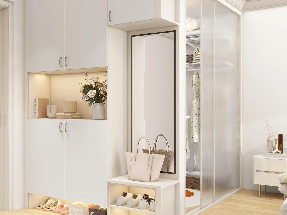 入戶式衣帽間首先它實現了視覺的統一性,可以將客廳玄關等位置所有的雜物藏起來。這樣一來,客廳入戶門裏面就會顯得更簡潔大氣,而且非常有秩序。