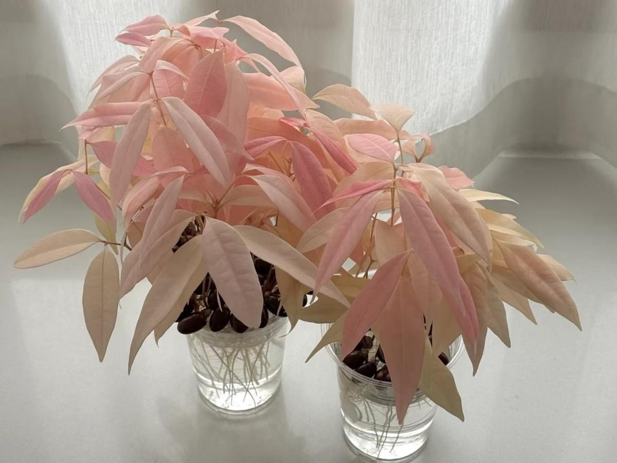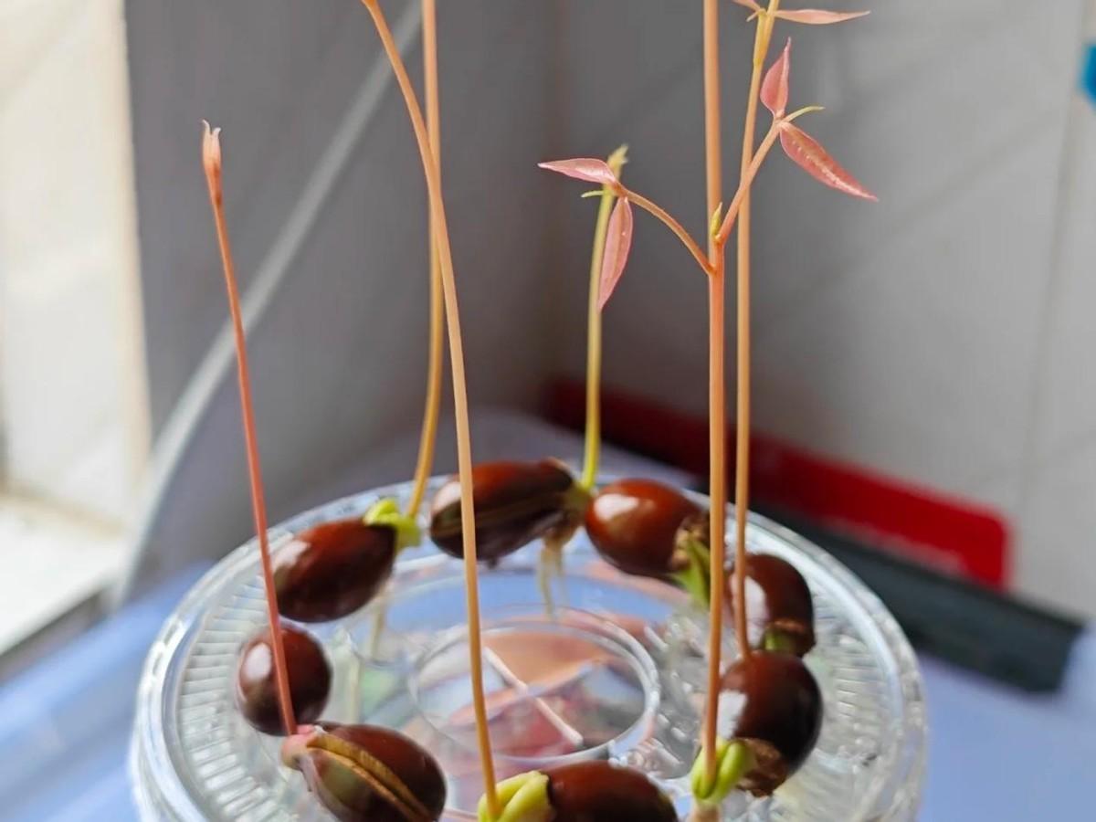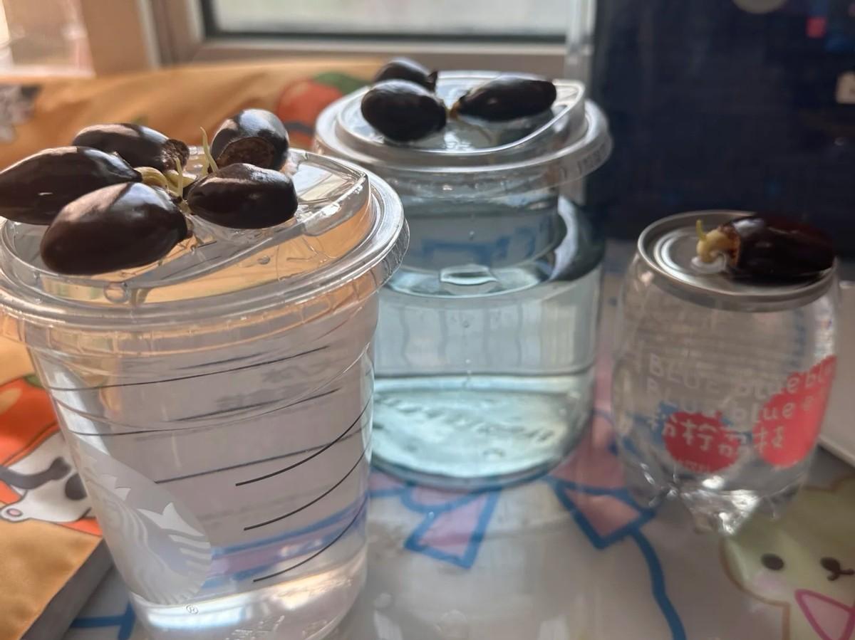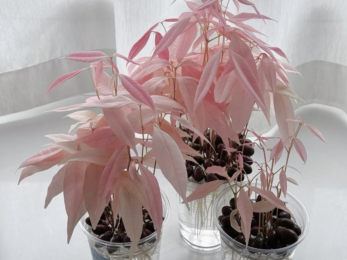 天津一女孩把荔枝核泡水杯裏,3周後長成“粉盆栽”,太好看了