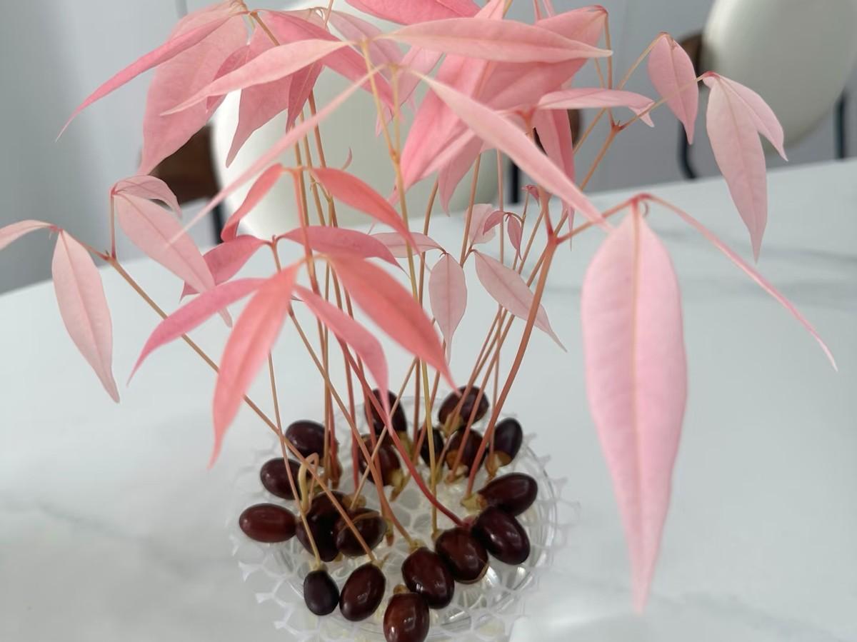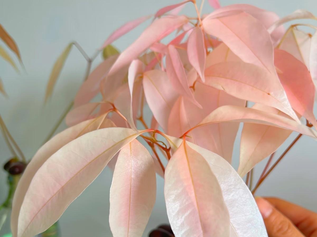 荔枝新芽出生時,呈現的粉嫩色澤是自然界造物的神來之筆。其獨特的葉綠素形成前的階段,也是粉盆栽得名的由來。