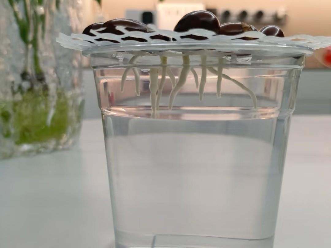 在此階段,白色的主根會向下生長,並可能長出很多細小的側根。透明的容器能讓你清晰觀察到根系的伸展。