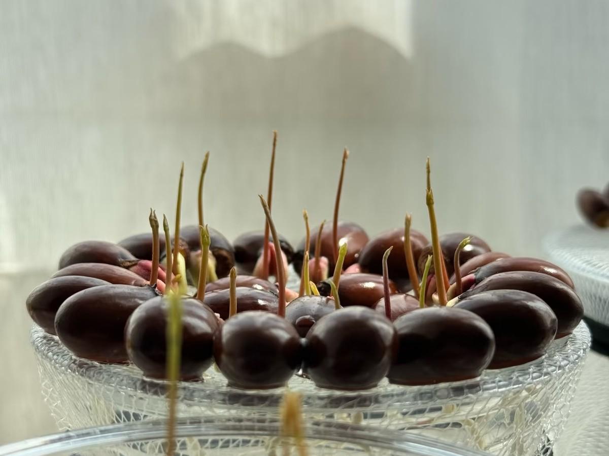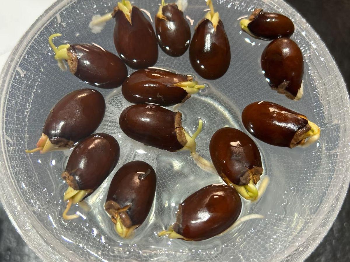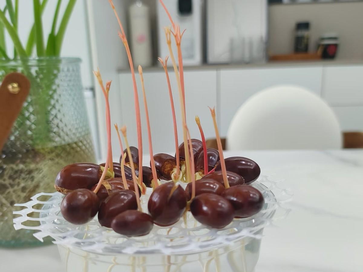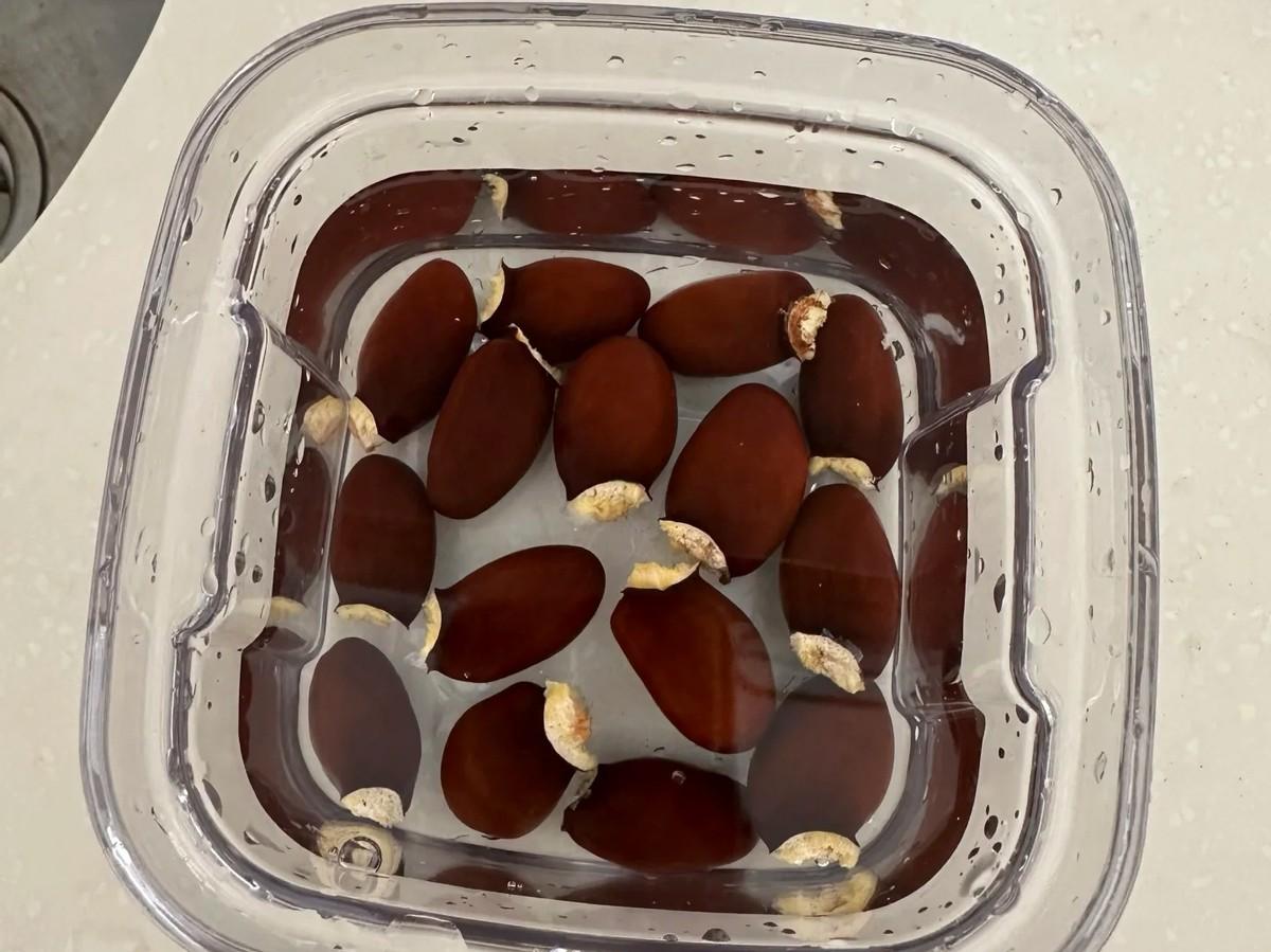 以後,每天換一次水,保持水質清潔,持續浸泡,一般5~7天。期間要注意觀察,果核可能會出現略微膨脹,部分果核尖端可能出現細小的裂痕,這就是要出芽的徵兆。