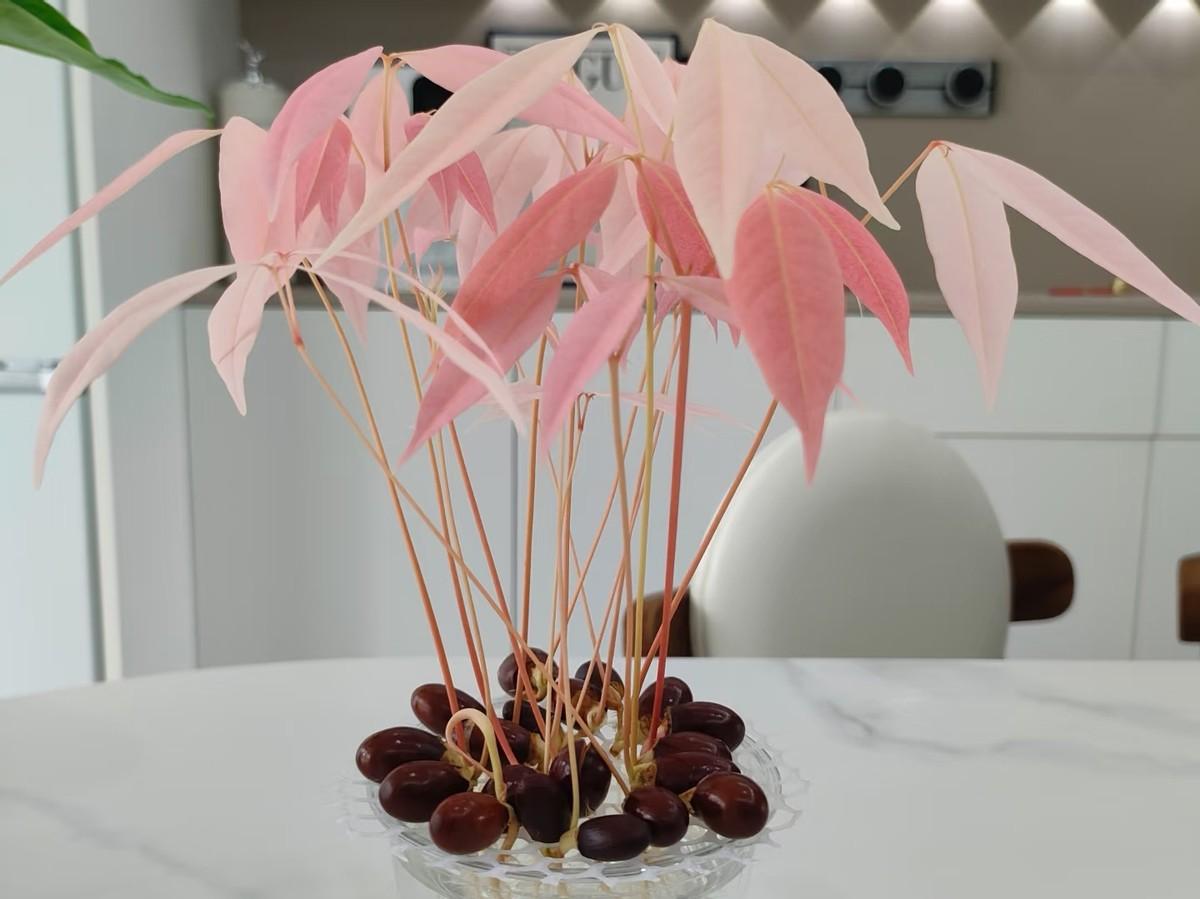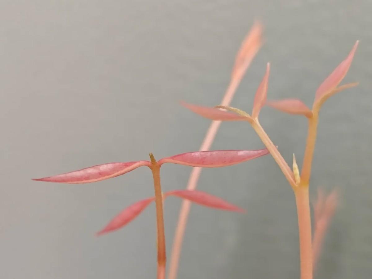 而粉色的芽孢會逐漸抽成小莖。頂端展開,小小的起初仍是帶粉色的嫰葉,隨着葉片逐漸長大並接受陽光。顏色由嫩粉,逐漸向綠色過渡。大概發芽後10天左右開始變化,形成粉綠相間的獨特情況。