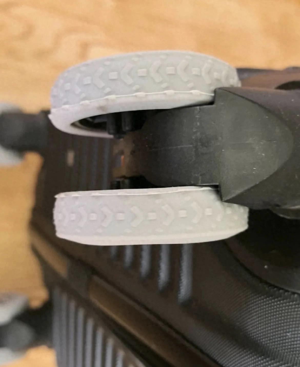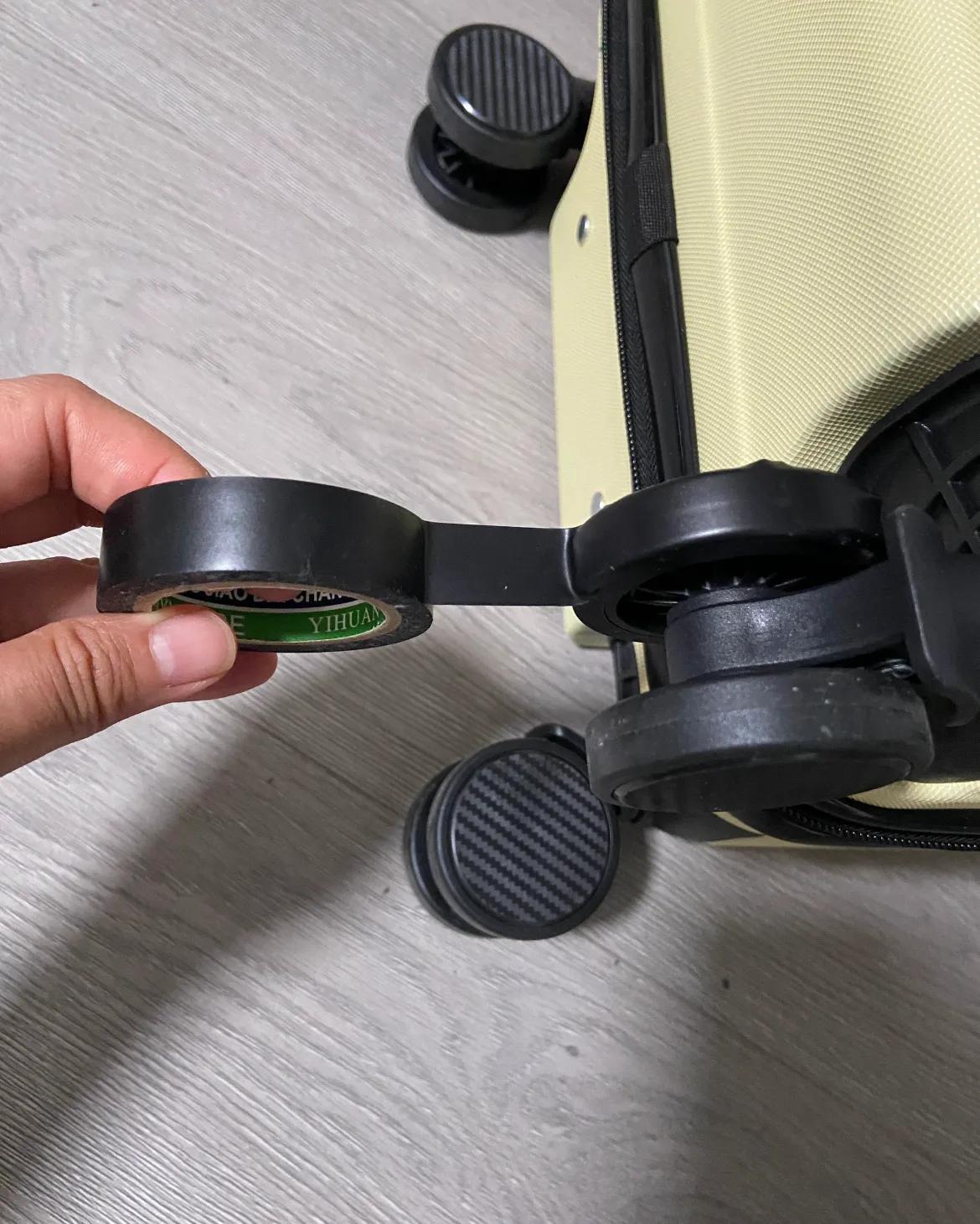 還不如絕緣膠帶來得實在,出門前在輪子上多纏幾圈,不費勁,薄軟更貼合,摩擦力也比硅膠套好,防磨降噪一樣能做到,回來撕掉,輪子都省的擦了。