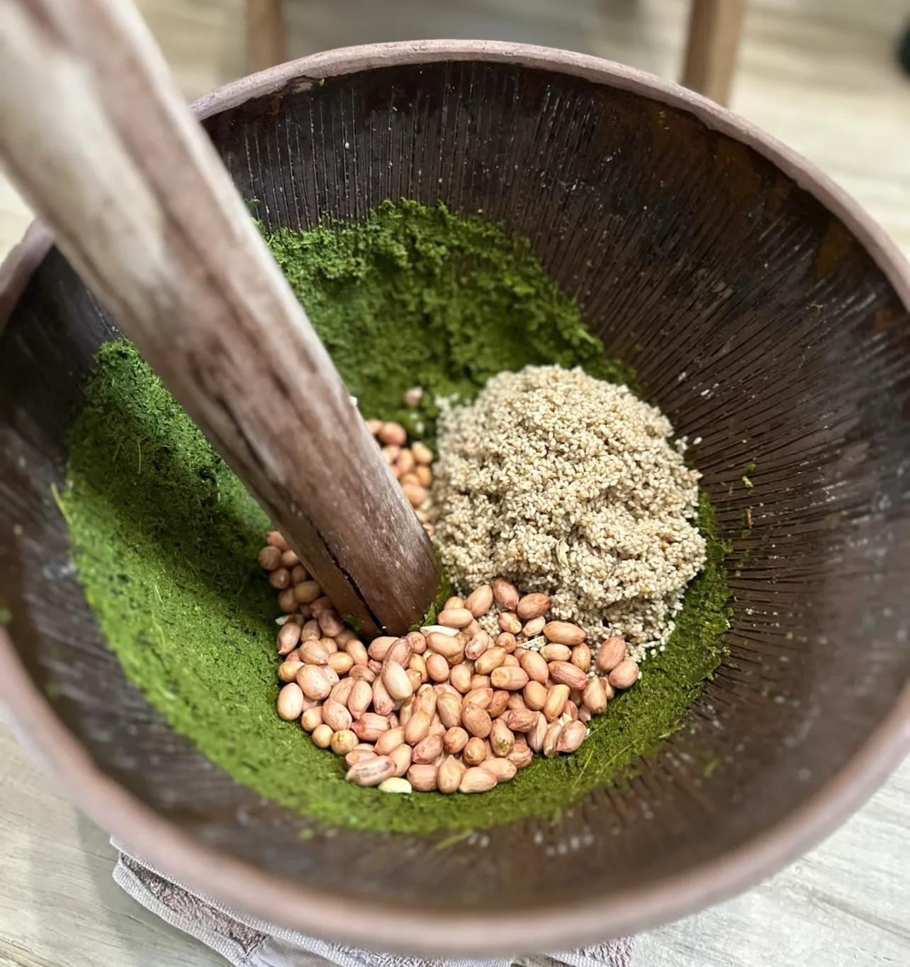 擂的意思,就是研磨,將新鮮茶葉擂成沫,再加入生薑、花生、芝麻、炒米,邊擂邊加水;