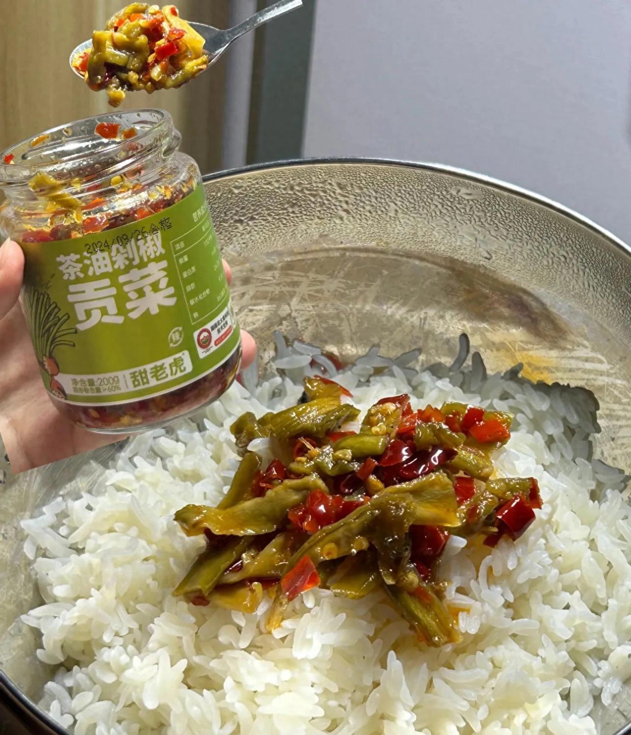 這醬是實打實的長沙特產、本土品牌。都說“色香味俱全”,它就是!紅配綠,賽……這回是賽一切;一開蓋,山茶籽油的香氣就直鑽鼻腔;喫起來貢菜tree tree的,混合着剁椒的鮮辣,一整個油潤脆爽。