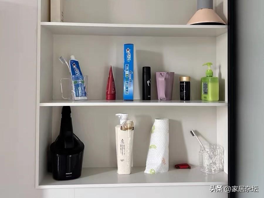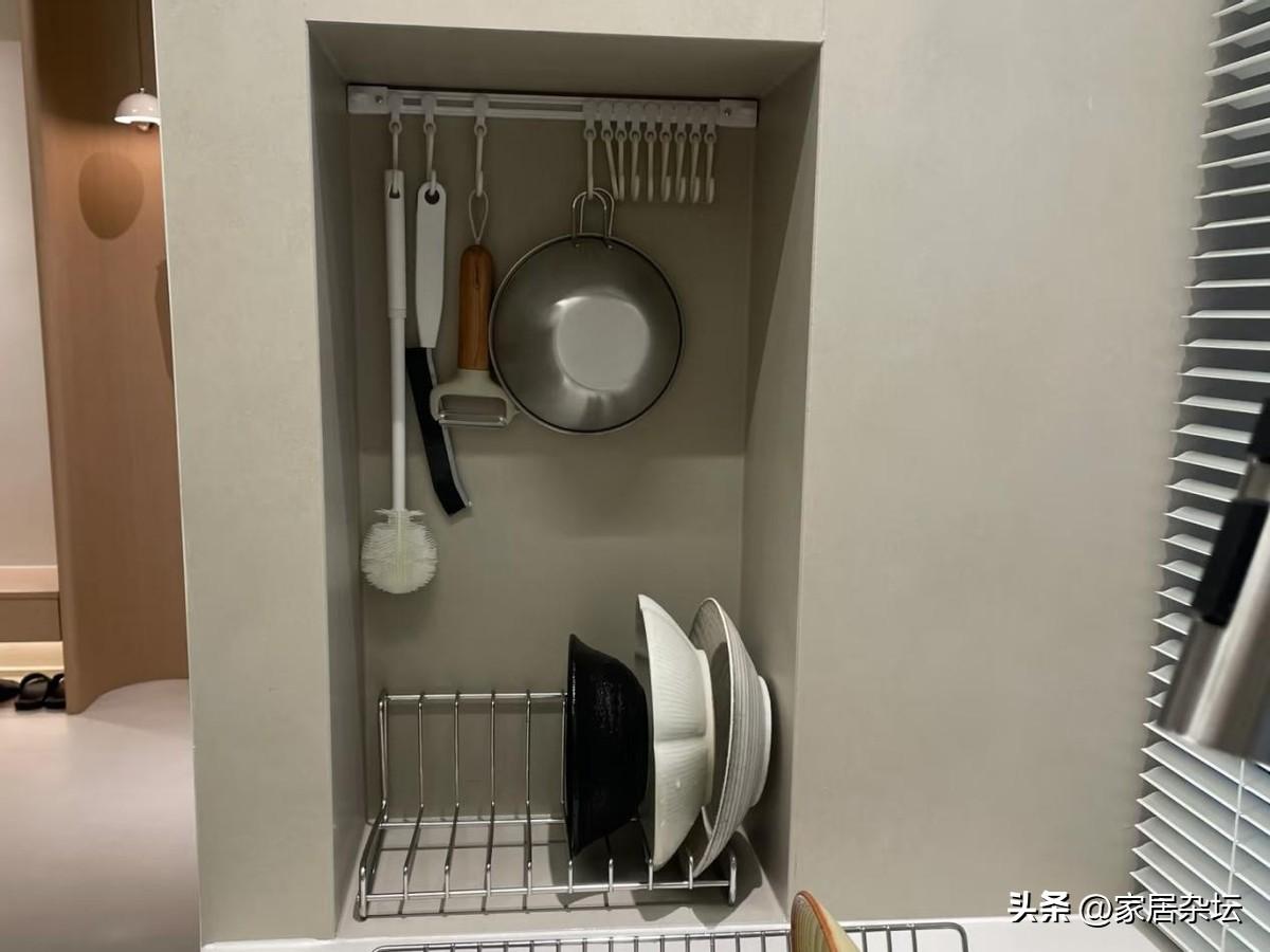 這種做法是利用衛生間或者廚房的管道井的牆壁。剔鑿深度10~15釐米的壁龕,然後內部可以貼防水或者是貼板材,加裝隔板做分層。