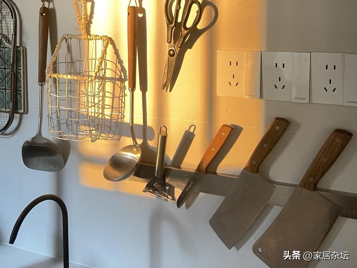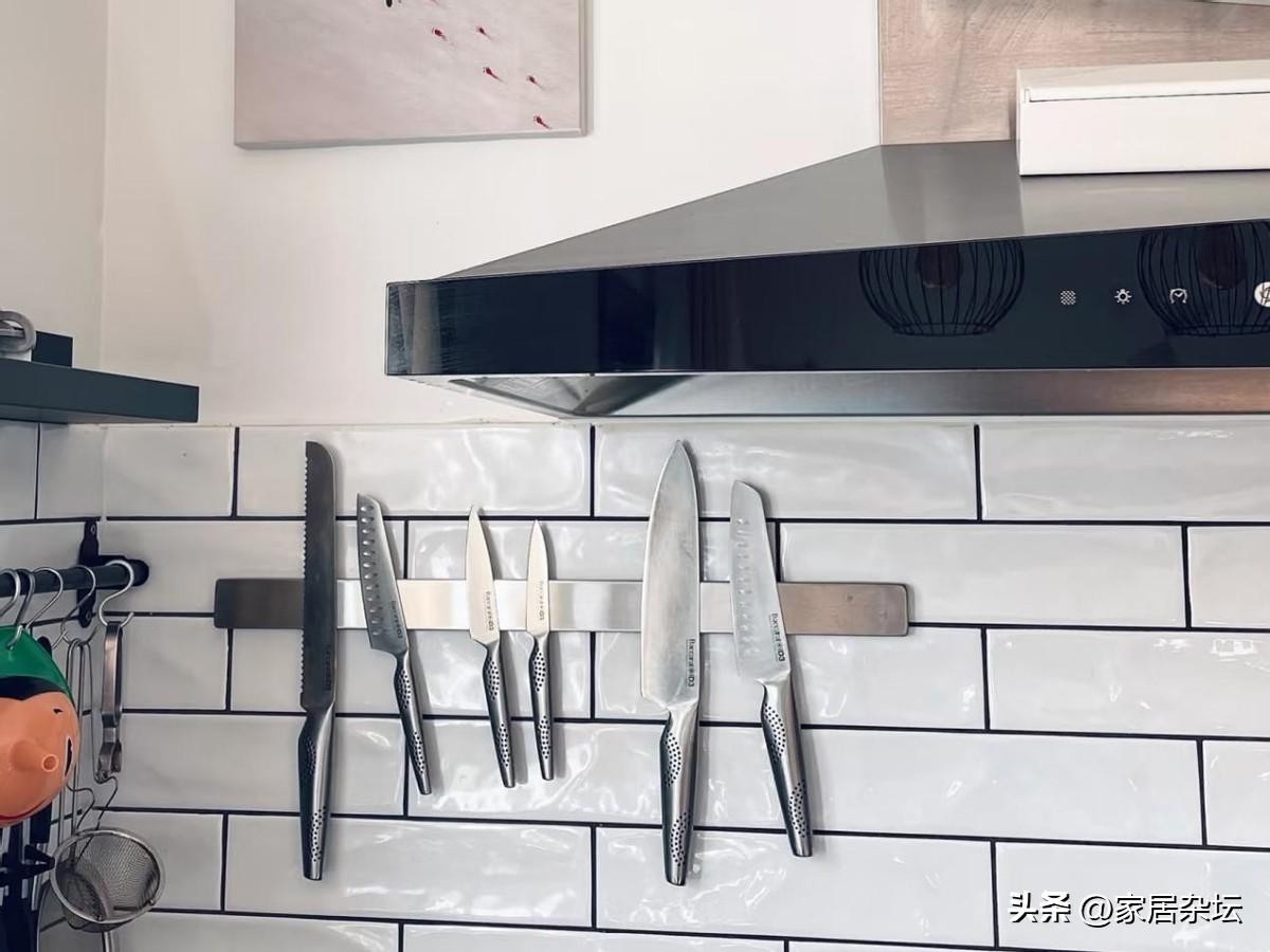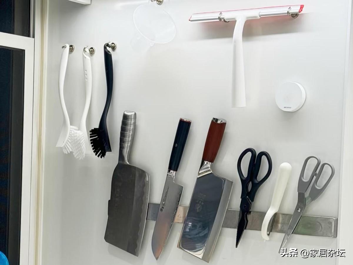 牆面磁鐵收納,利用強磁鐵條或者是磁鐵板安裝在牆面。做法就是選擇寬度適中,例如5~10釐米的磁鐵條,用螺絲固定的牆上,然後家裏常用的金屬工具,比如剪刀,菜刀螺絲刀,都可以掛在上面。