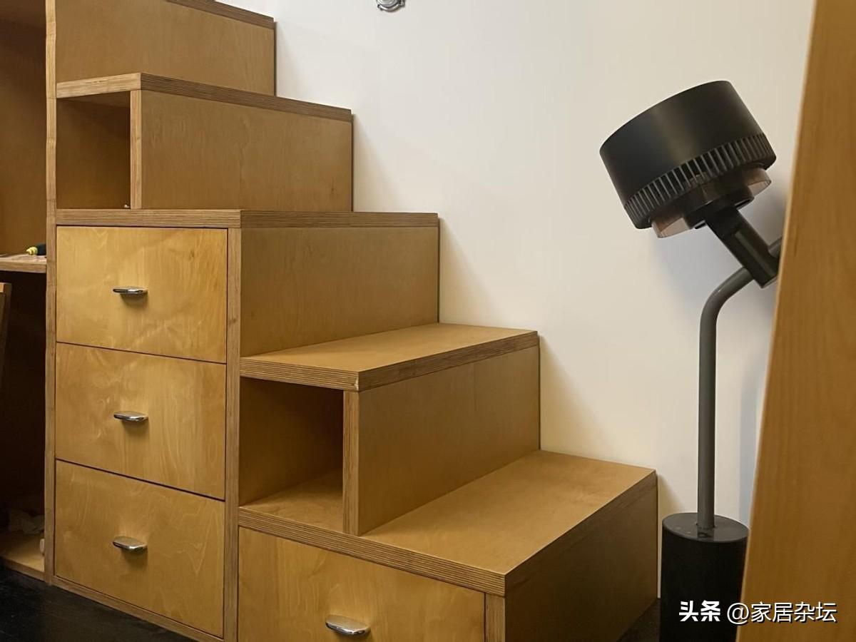 針對複式或者是閣樓的房型,將樓梯踏步改造成抽屜。測量好踏步的尺寸,通常深度30~40釐米,寬度60~90釐米,然後定製木質的抽屜,加裝滑軌。