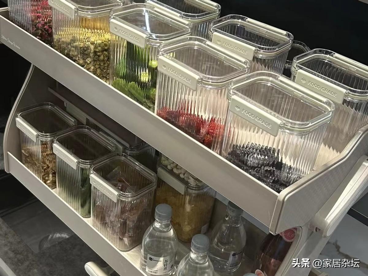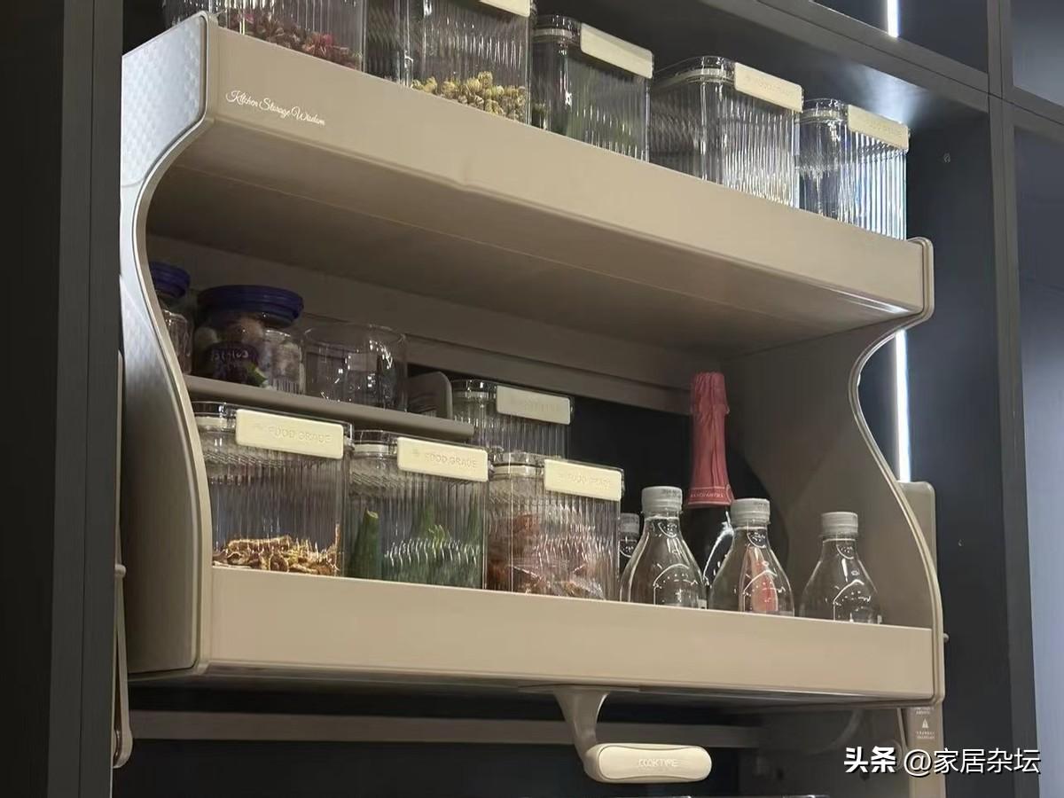 在吊櫃裏面安裝升降拉籃系統,承重力要大一些,可以採用雙槓同步的升降機,配備阻尼緩衝裝置。在拉籃內部,設計爲可調節分區,用來存放糧食,調料,再好不過了。