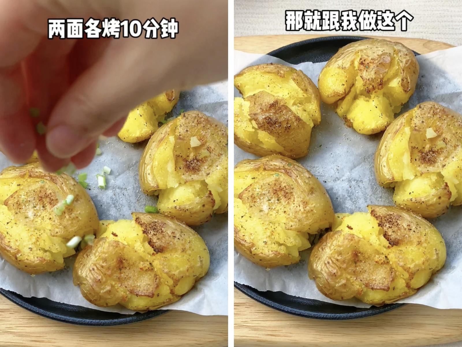 做法也簡單:土豆洗乾淨,帶皮煮20分鐘左右,撈出來用杯子底壓扁,給它凹個造型。撒點歐芹大蒜鹽,表面噴少許油,空氣炸鍋180度兩面各烤10分鐘。出鍋前可以撒點蔥花~香噴噴的烤土豆就搞定啦,真的推薦你們試試!