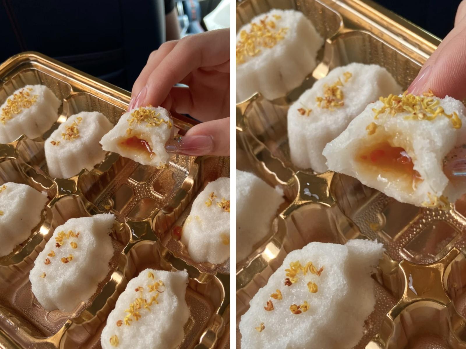 外面是紮實的米糕,裏面是濃郁的桂花流心,兩種口感碰撞超級驚豔~喫完滿嘴都是桂花香,整個人像泡在桂花壇子裏似的!喫的時候小心爆漿,別問我怎麼知道的……
