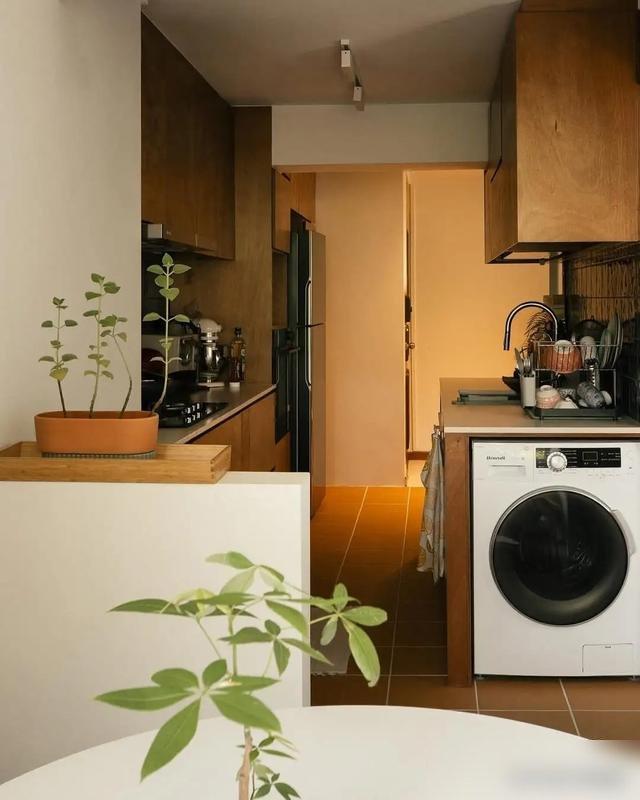 廚房更絕,laundry藏進地櫃,洗衣機跟鍋碗瓢盆做鄰居,排水管順牆而下,省出一條走道還能跳支舞。
