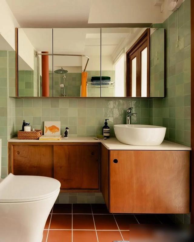 衛生間乾溼分離不說鏡子直通天花板視覺上double尺寸;懸空臺盆給掃地機器人一條跑道;綠磚深淺漸變像抹茶拿鐵拉花——原來乾溼分區也能玩出小清新。