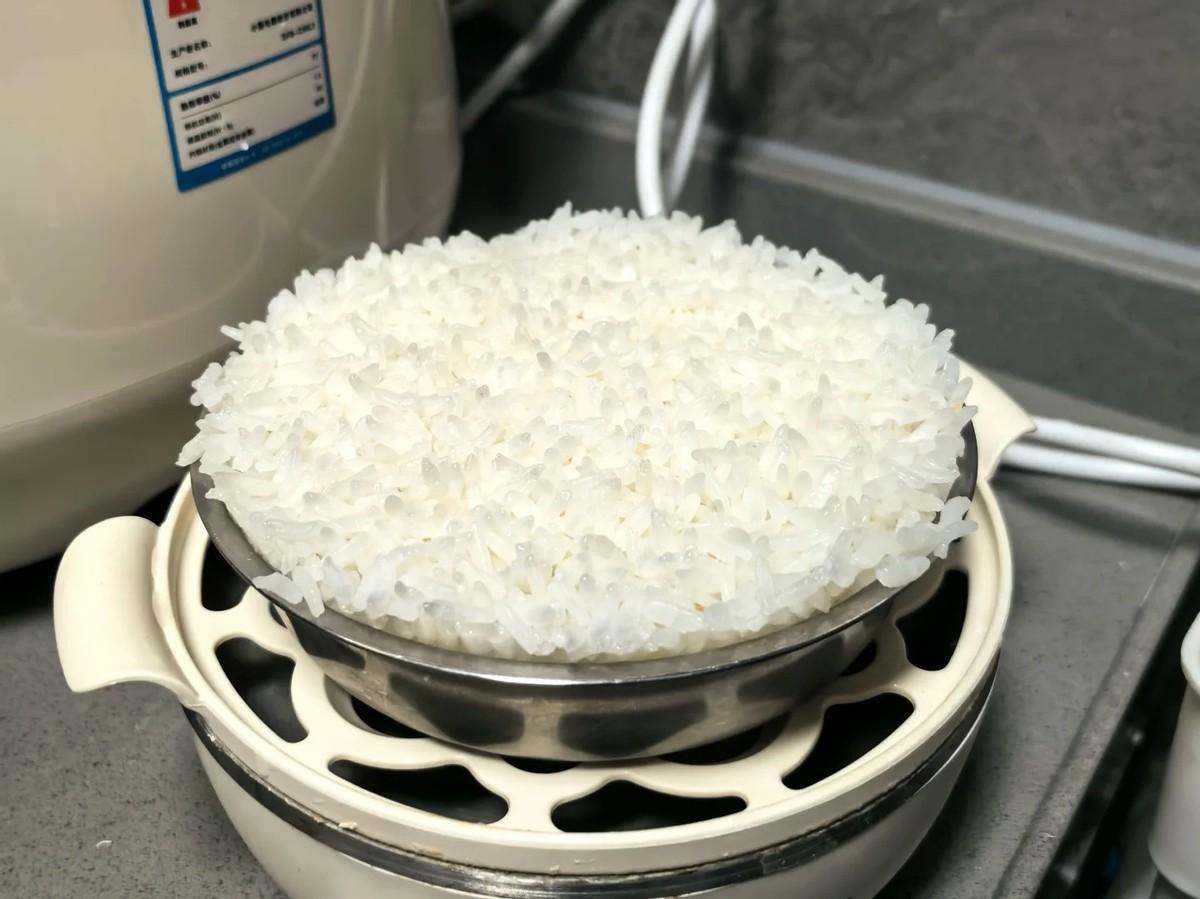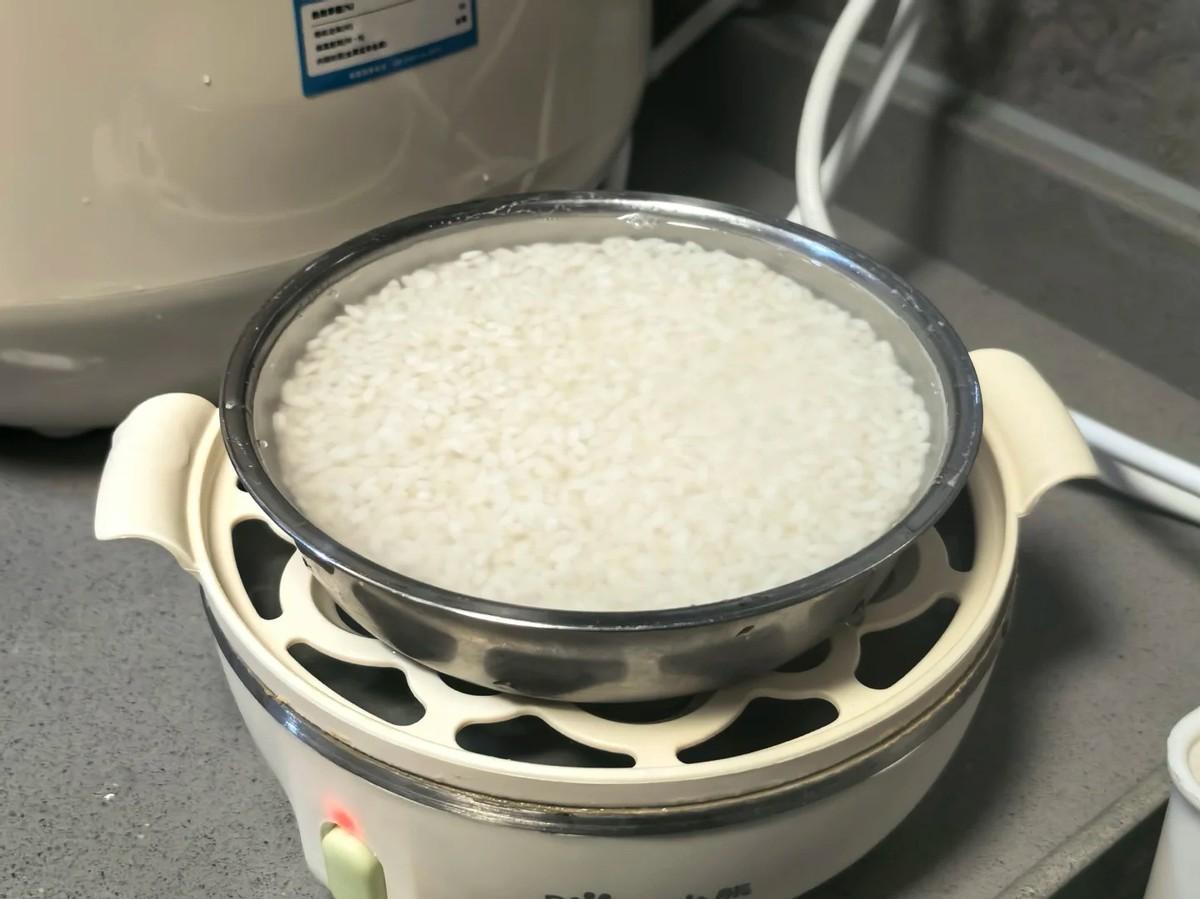 用小一些的碗裝米和水,比例是1:1.2,之後直接放入我蒸蛋器的蒸格中。