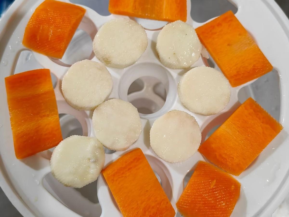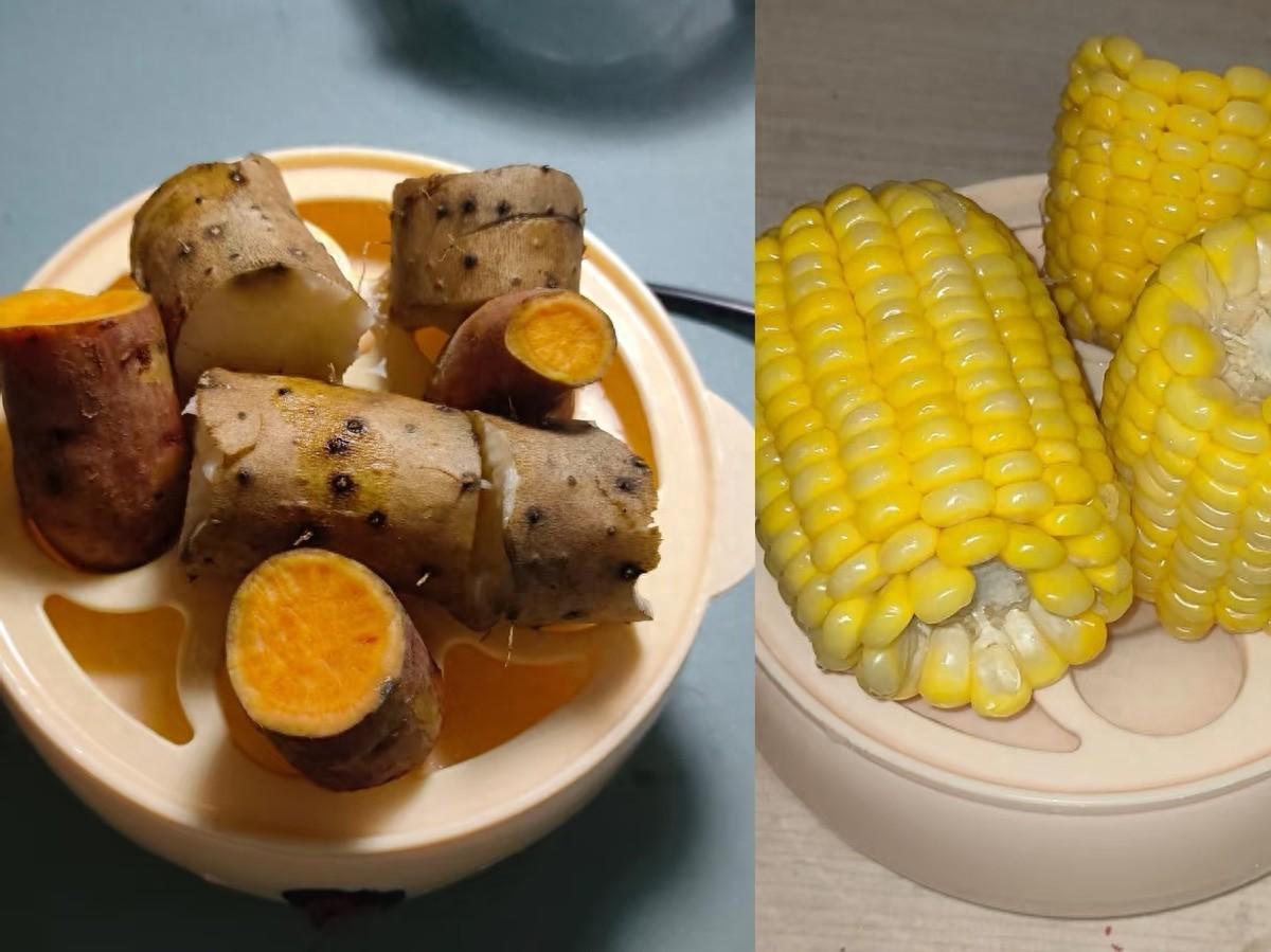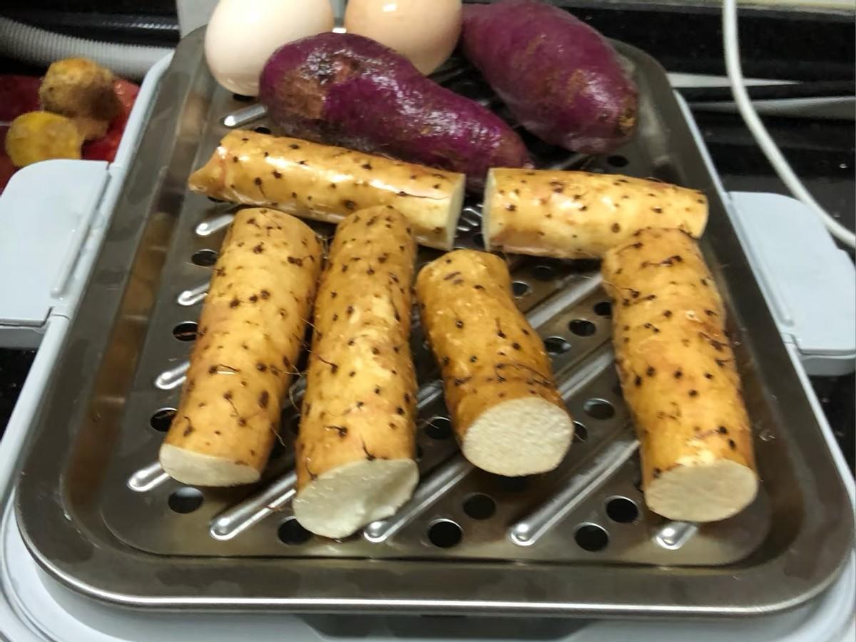 常規用法是將紫薯塊,玉米段,山藥片等同時放入,然後加入適量的水就可以了。