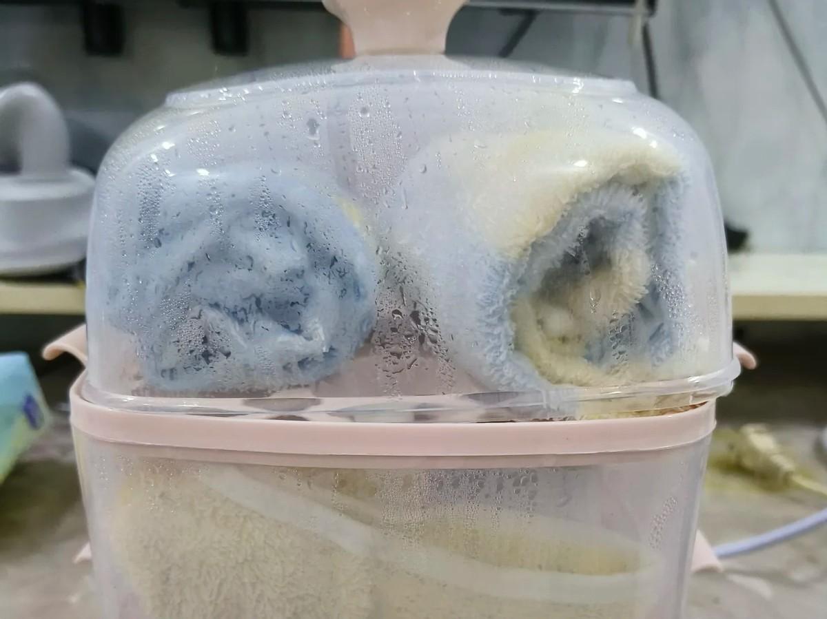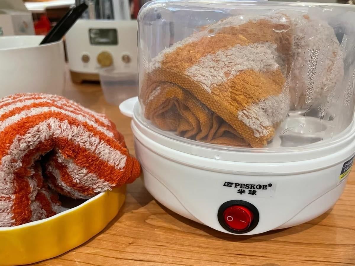 冬天毛巾很涼,那麼我們把溼毛巾疊好放入蒸蛋器,蒸三分鐘就可以獲得熱毛巾。