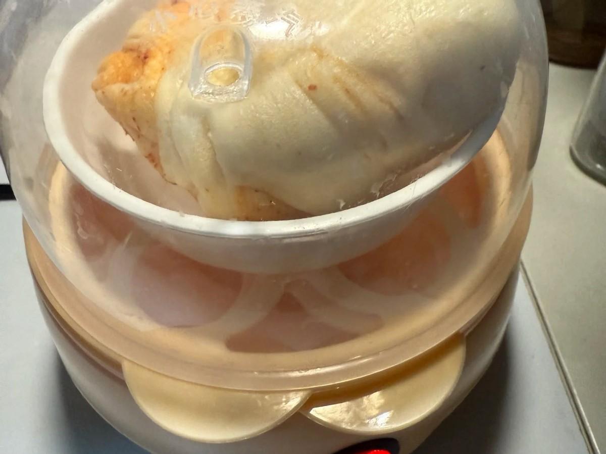 家裏冷凍的包子或者是饅頭,不需要解凍,表面噴水後直接放入蒸蛋器的蒸格中。