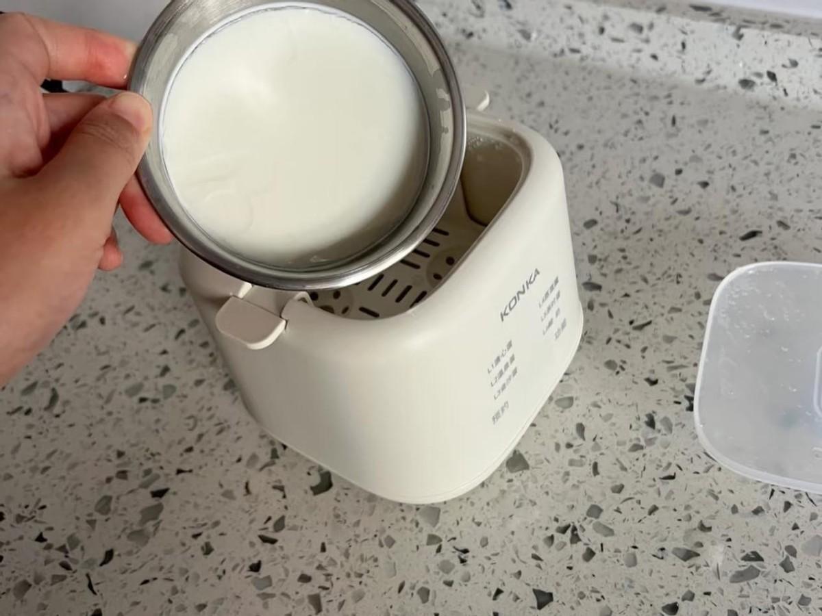 在牛奶中加入菌粉,然後攪拌均勻。在蒸蛋器中設置40度恆溫發酵8個小時就可以了。