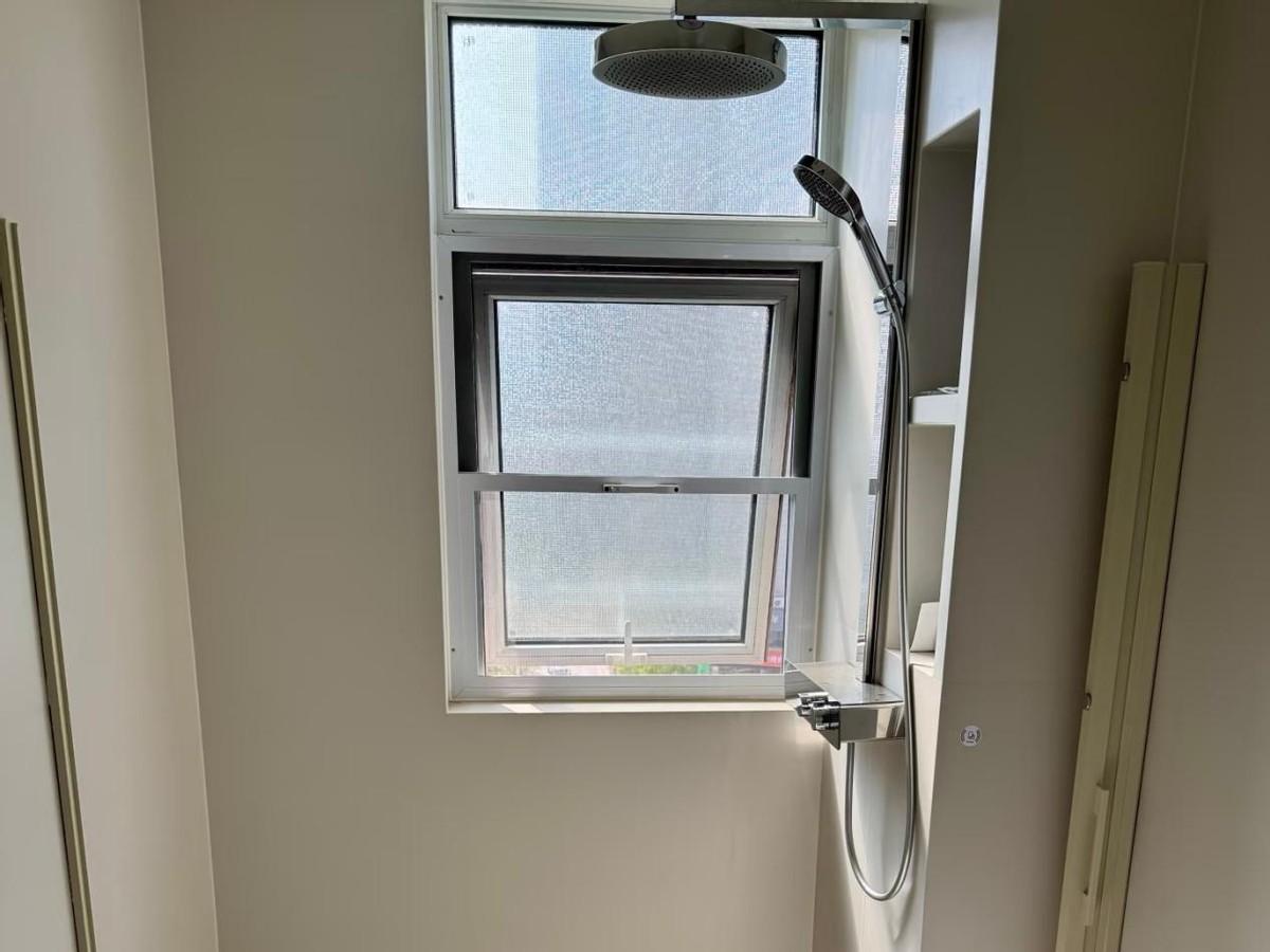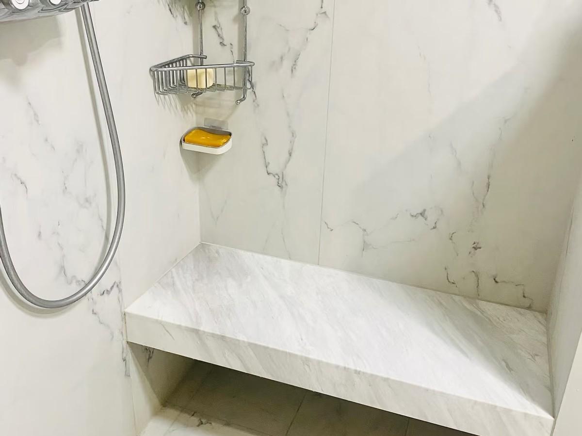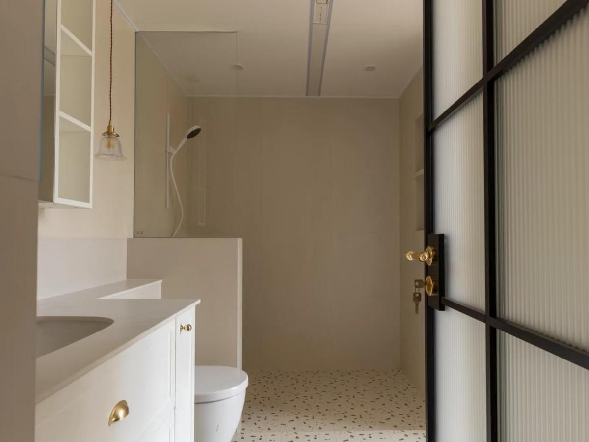 淋浴的區域比外面的區域下沉了2~3公分。但是,在邊緣區域是採用了斜坡設計。在原來安裝玻璃隔斷浴房的地方,安裝了隱形的浴簾。