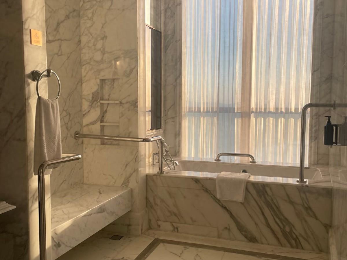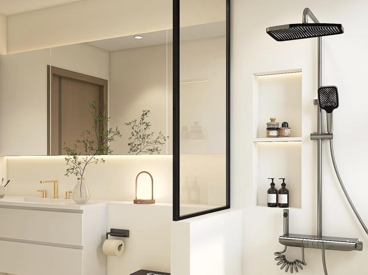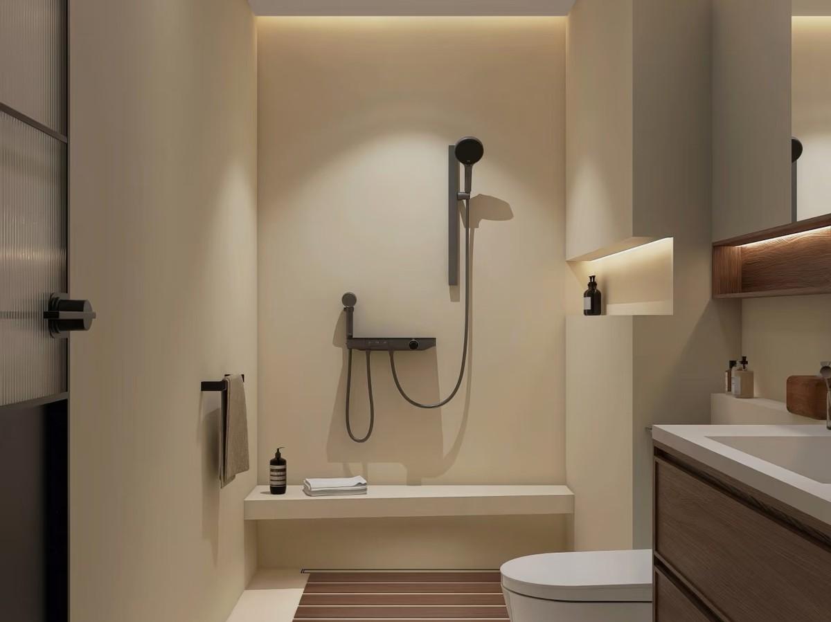衛生間內可能還包含了座位區,多層花灑系統,氛圍感滿滿的燈光設計。