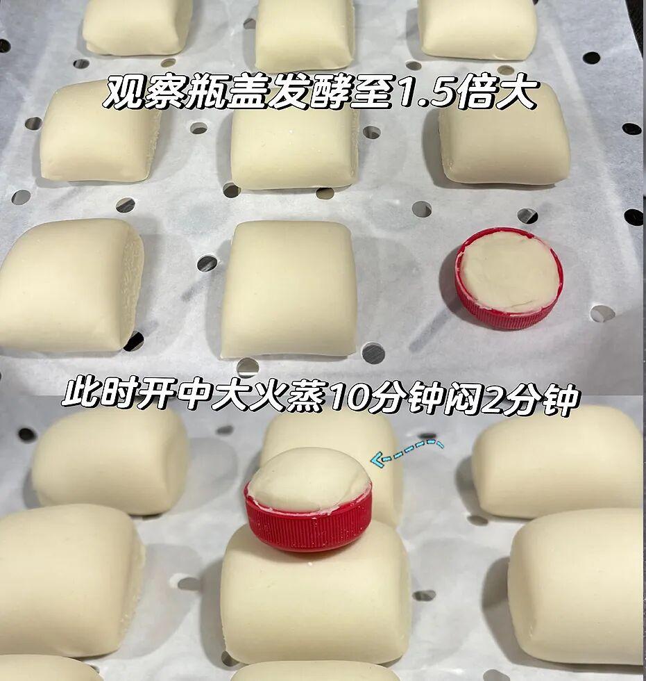 而現在的年輕人做饅頭,都是做好饅頭形狀後一股腦放進鍋裏,取一塊塞進瓶蓋,等瓶蓋內的坯體發酵1.5倍就說明發酵好了。