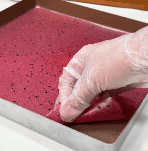 煮熟的蘋果+火龍果用料理機打碎後,倒入不粘的烤盤中,鋪平整。