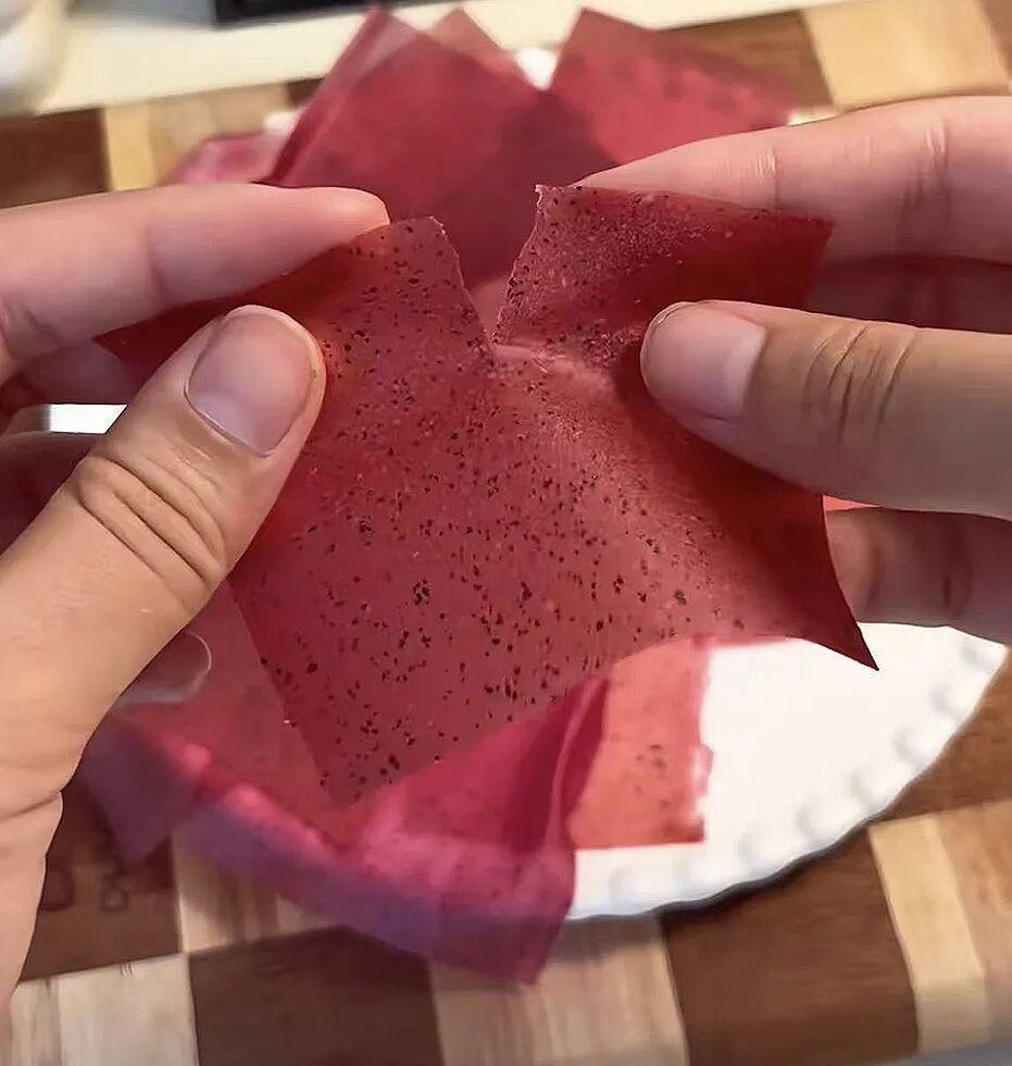 然後烤箱提前預熱,90度烤120分鐘,烤好久就能輕鬆撕下來,剪成小塊給寶寶喫,酸甜又開胃。