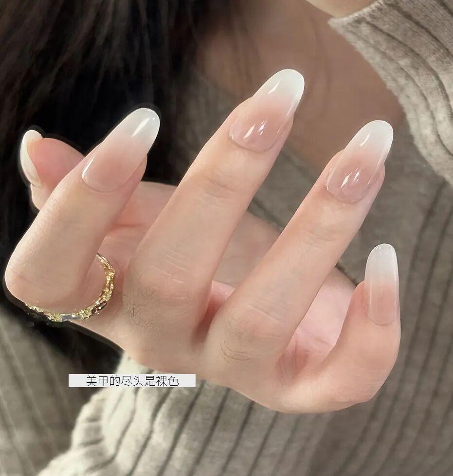 這款美甲底色是溫柔裸粉,簡簡單單,乾淨透亮,能讓手指顯得修長纖細,還提氣色。