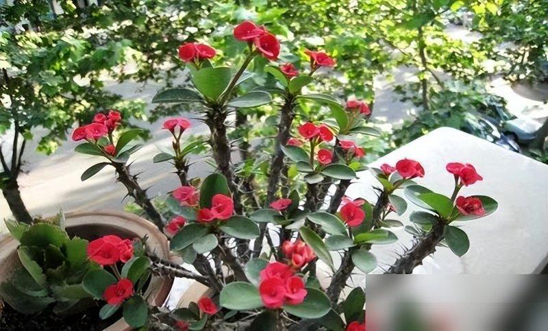 我家那盆紅虎刺梅從春天開到現在,夏天扦插得注意:戴手套剪枝(別扎着手),把白色汁液擦乾淨,晾兩天再插河沙裏(河沙透氣,不容易爛根),別澆水太勤,保持沙有點潤——一個月左右就紮根了。