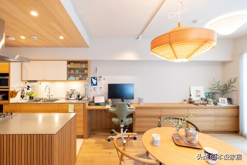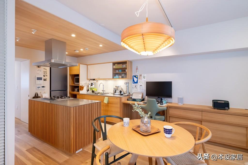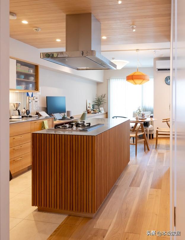 II型佈置的開放式廚房,地面鋪設的是米黃的瓷磚,好打理,而天花則是毛山櫸飾面板,通過材質來劃分不同的功能區域。