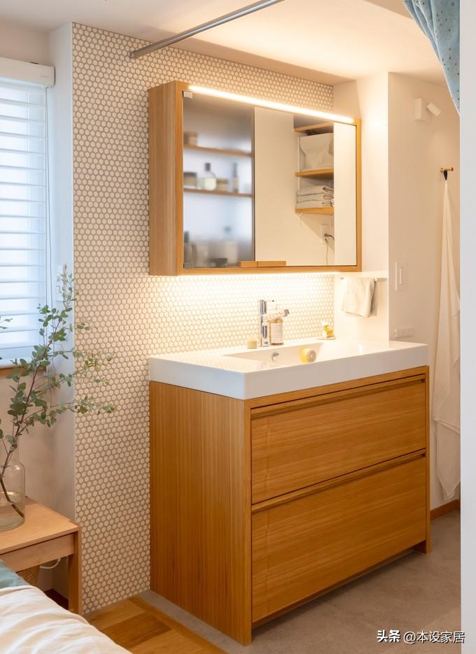 原木色的檯面規劃和鏡面櫃,都被她收拾得一塵不染,除了洗手液,其他都完美收納起來,無比舒適。
