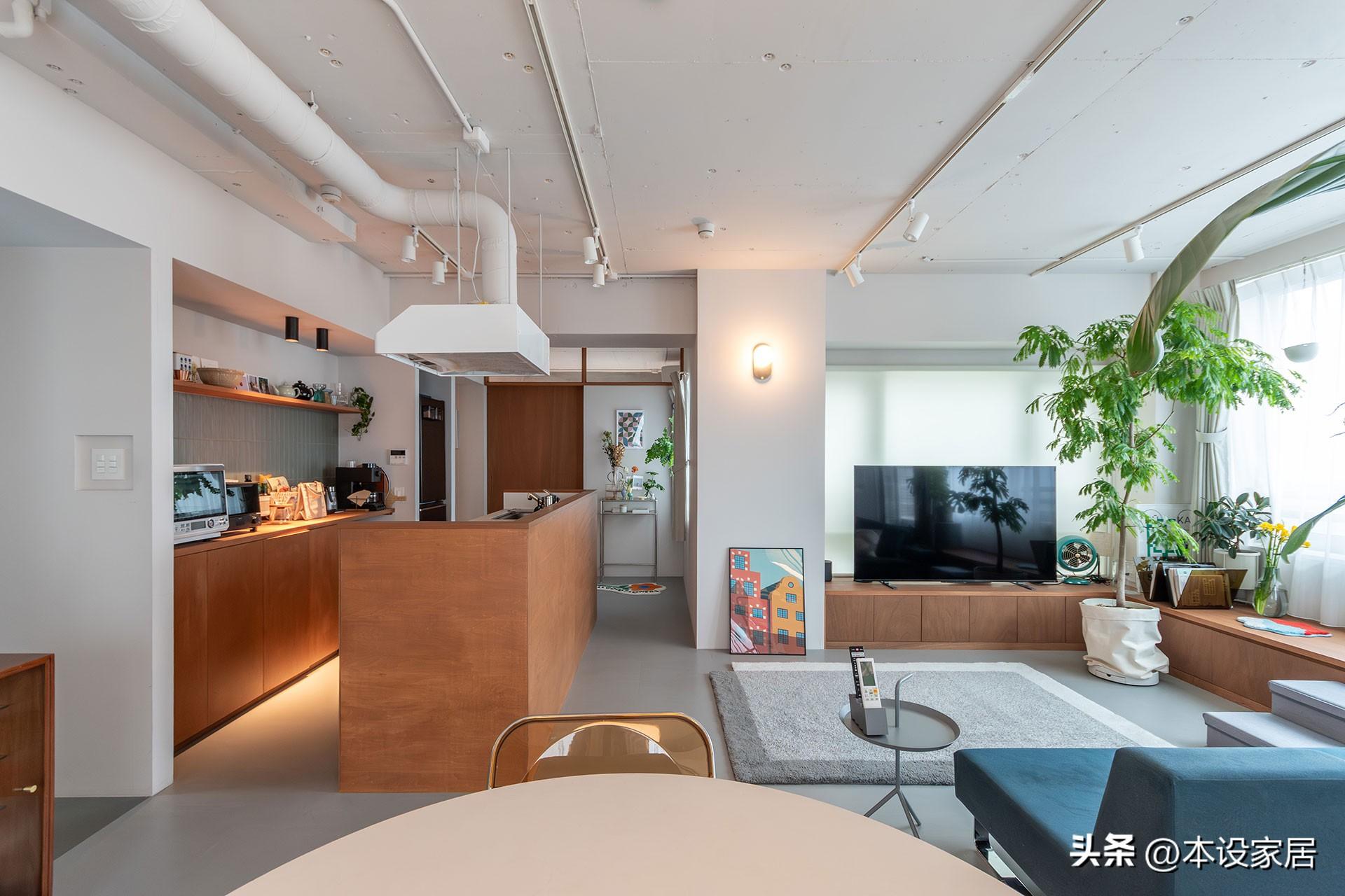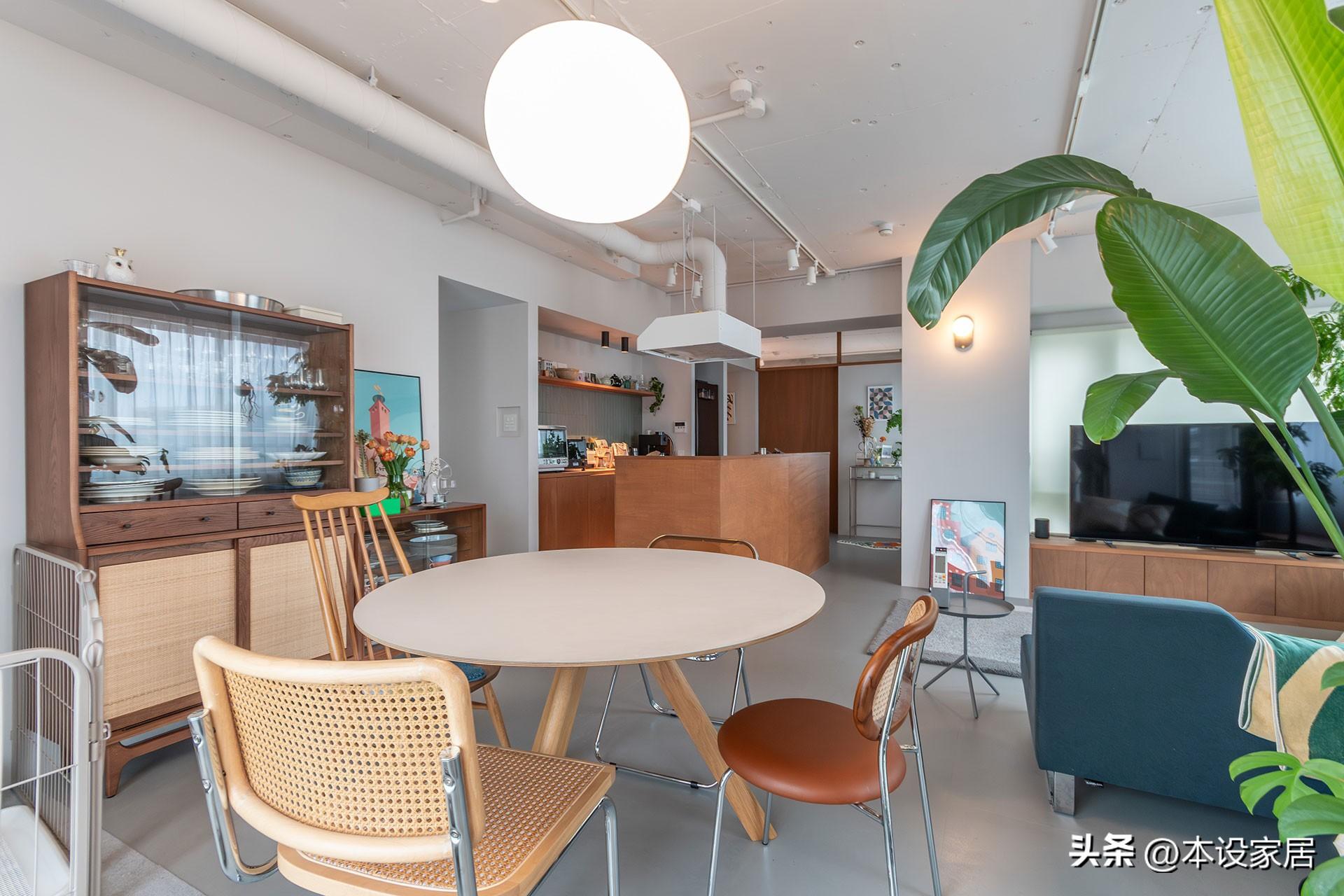 穿過玄關,就是一個集客廳、餐廳和廚房的大空間,地面水泥自流平,牆面不造型,天花不弔頂,不僅省錢顯寬敞,還能減少空氣污染,也容下了獨居所應具備的功能。