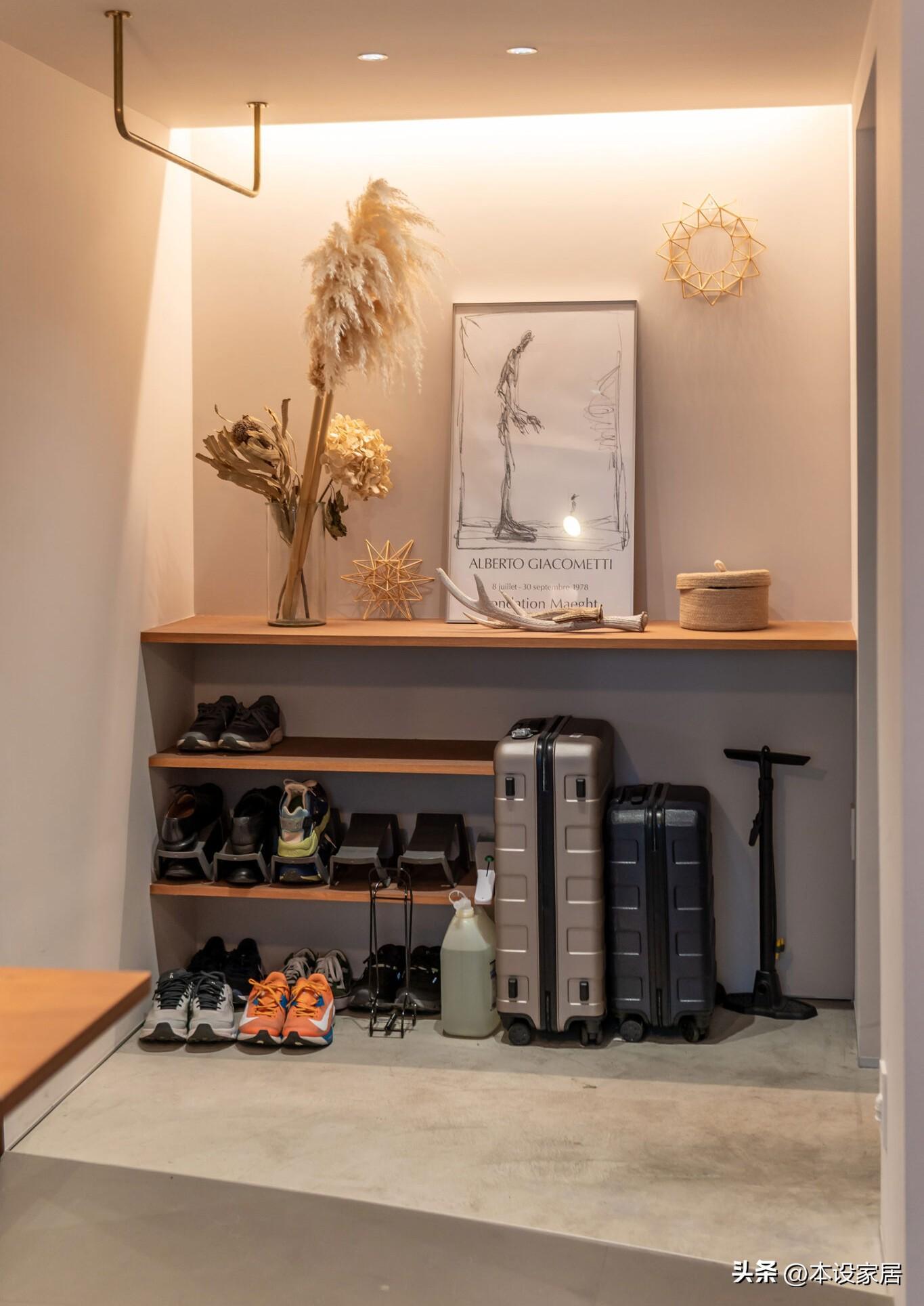 考慮到獨居物品不多,他沒有定製帶櫃門的儲物櫃,只是靠牆安裝了三個木質層板,天花安裝一個不鏽鋼架,滿足日常鞋靴、衣物和旅行箱的收納需求。