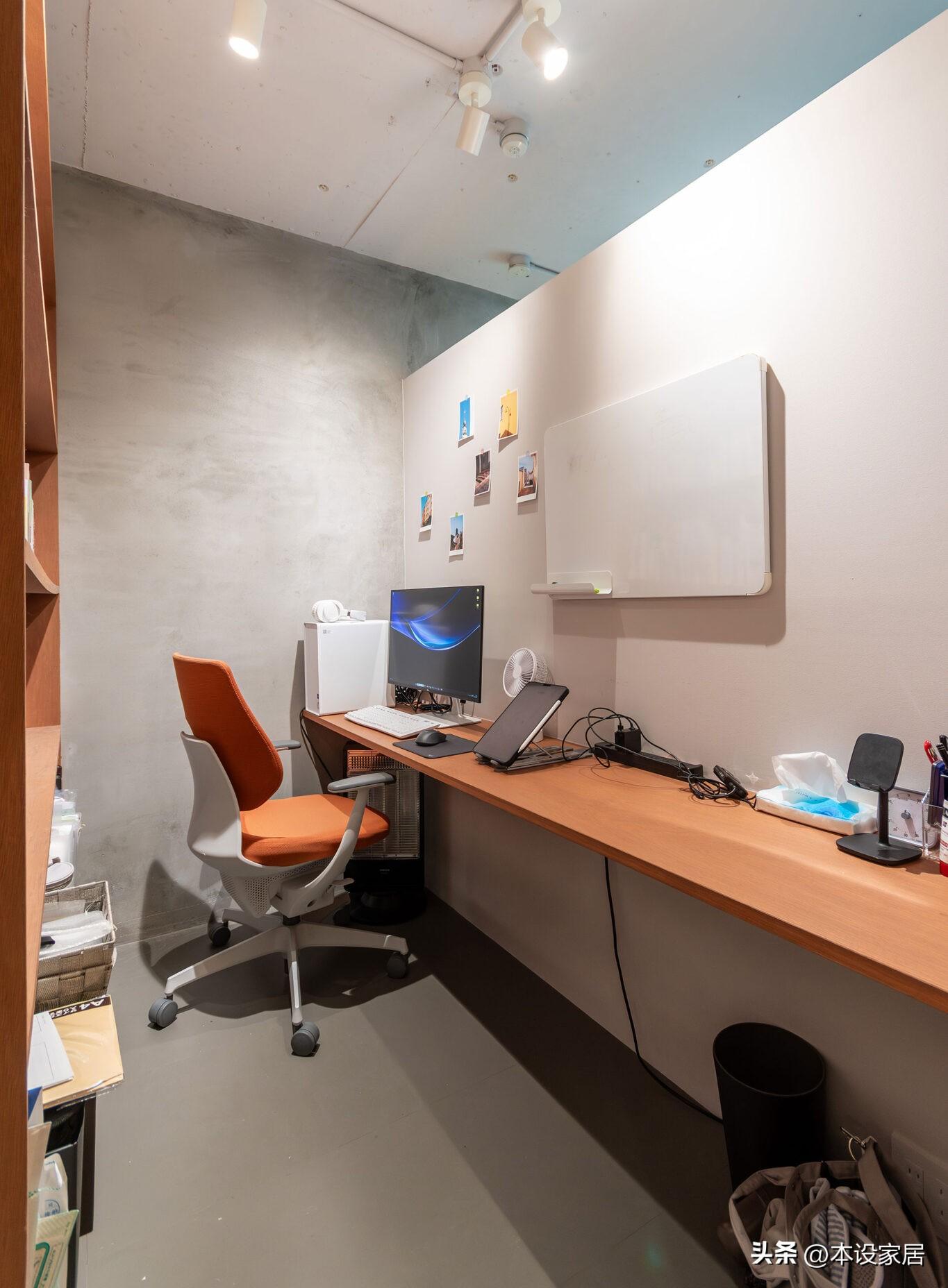 書房與臥室僅一牆之隔,地面和牆面都使用水泥灰,搭配錯落有致的開放格書架和書桌,藏着一份不被打擾的自在。