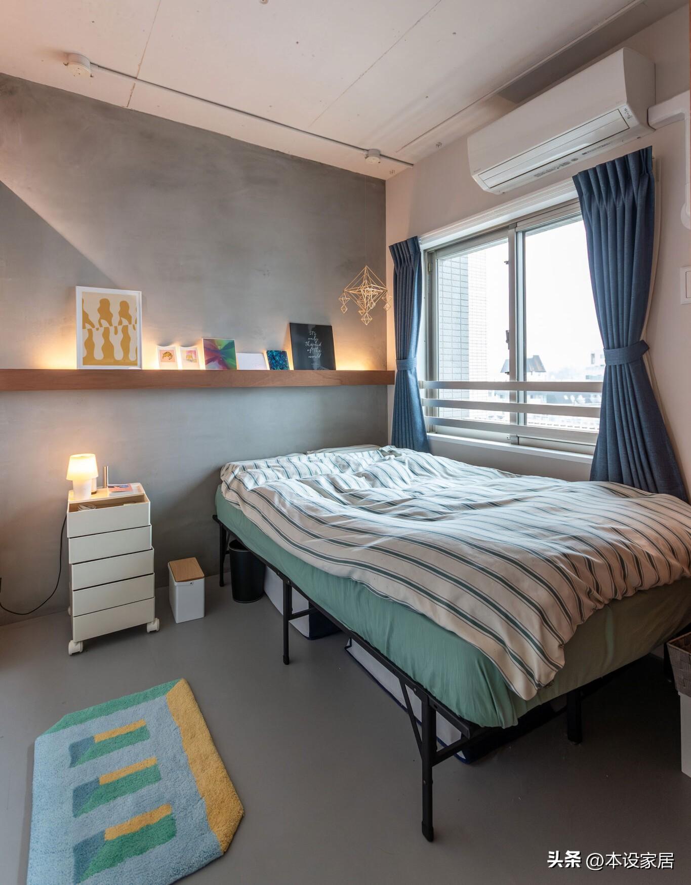 臥室面積約8㎡,由於有獨立的衣帽間,除了靠窗佈置一張1.2米單人牀和簡易牀頭櫃外,沒有多餘的傢俱,灰色的水泥牆面,營造出簡潔又不失巧思的靜謐氛圍。
