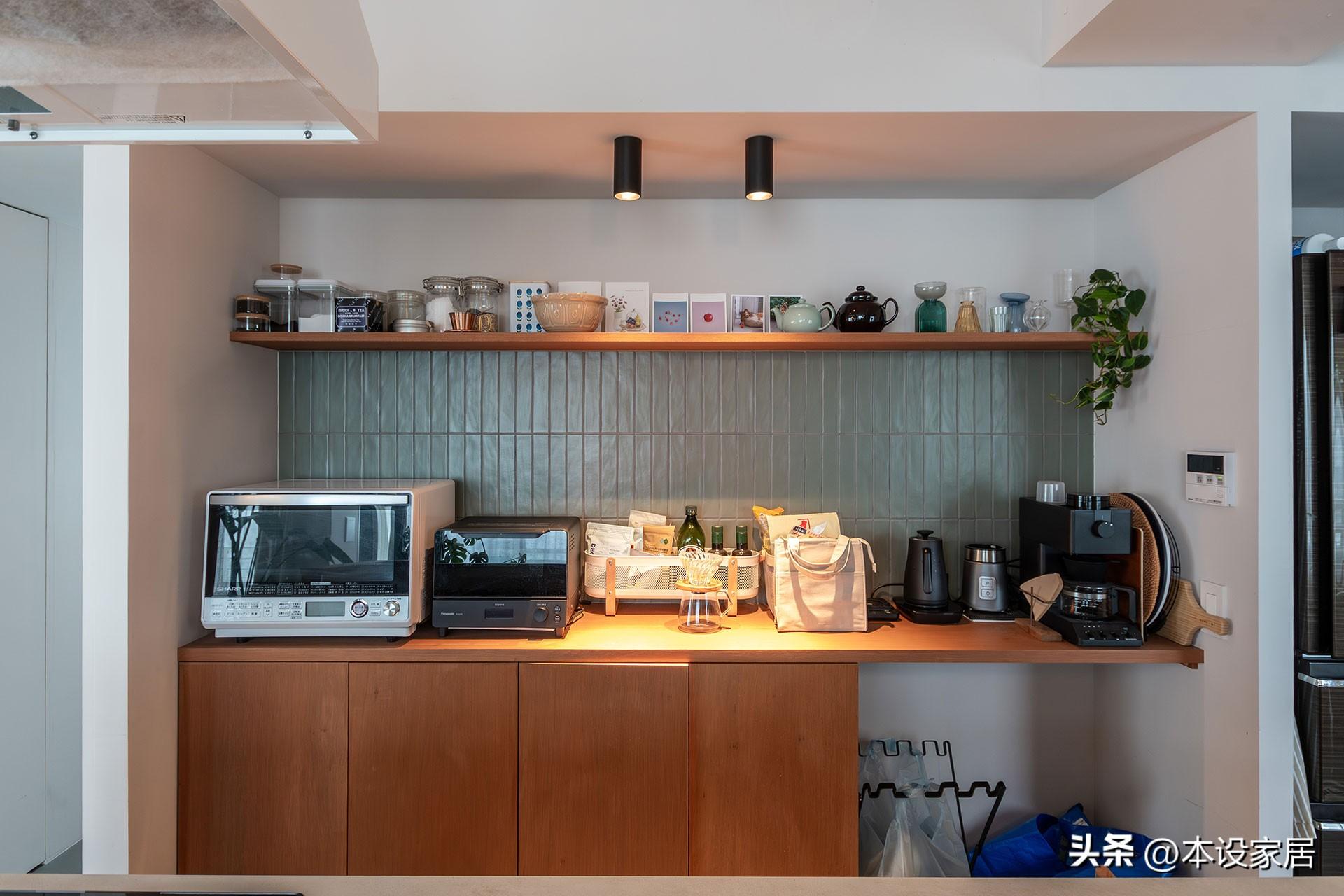 敞開式的廚房設計,簡約溫馨,木質元素與白色的搭配相得益彰,每件廚房電器和用品都擺放的整整齊齊,在暖暖燈光的渲染下,營造出一種清新自然的空間氛圍。