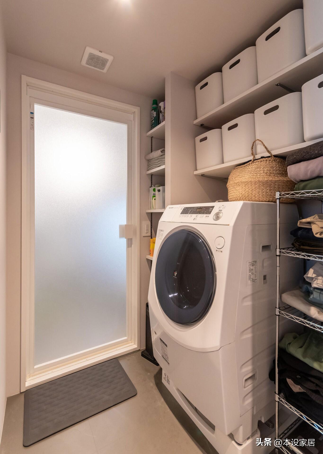 洗烘一體機設置在洗浴室門口,換下來的衣物可以直接扔進去,省去了拿來拿去的麻煩,結合收納盒,把擦手巾、清潔劑、消毒劑等清潔用品都整整齊齊地排列,好舒適。