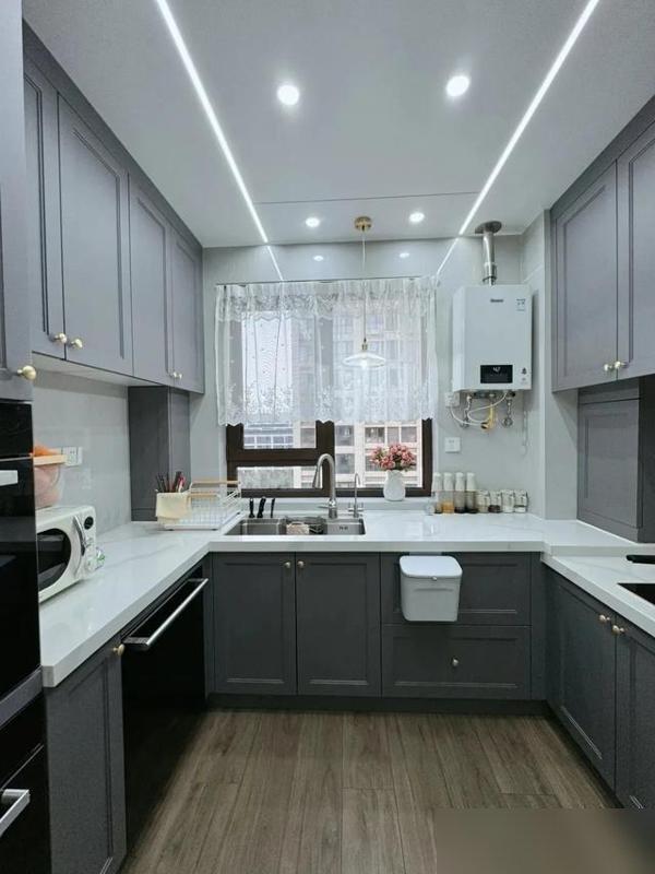 廚房的U型佈局簡直是中國家庭的“寶藏設計”,地櫃吊櫃全打滿,鍋碗瓢盆各歸其位,黑白配色像穿了件耐髒的白T,擦起來也方便——比那些花裏胡哨的馬卡龍色廚房實在多了,畢竟誰天天做飯願意對着一堆難擦的彩色瓷磚?