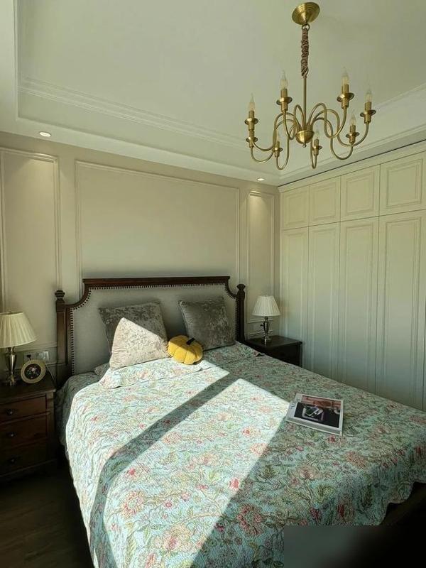 臥室又回到美式的“紮實感”,紅黑櫃子配紅窗簾,不是那種扎眼的亮紅,是像紅酒一樣的深棕紅,摸着木頭的紋理都覺得暖;牀頭牆的石膏線和客廳呼應,像家裏的“家族暗號”,到頂衣櫃沒留衛生死角,連換季的被子都能塞進去——你說,臥室不就是要“能躺能裝”嗎?那個波浪形落地燈太戳我了,晚上開暖光,光從波浪紋裏漏出來,像給臥室蓋了層柔紗,坐在飄窗的軟墊子上看書,曬着太陽喝個茶,這不就是普通人想要的“家的溫度”?