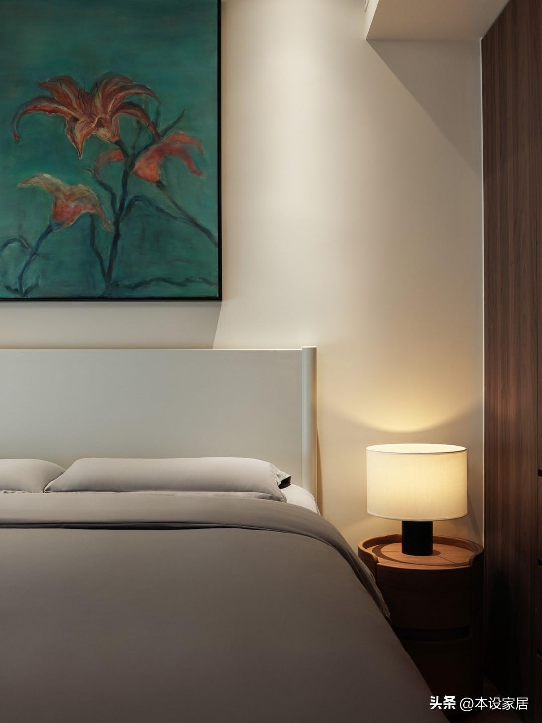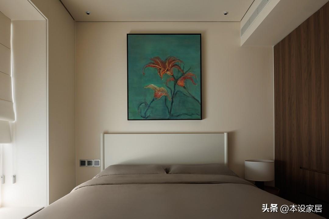 主臥延續了整體現代原木的格調,地面鋪設木地板,牆面大面積刷米白色漆,並保留了飄窗,而牀架和牀品同樣選用米色系,搭配淺韻的裝飾畫,散發出一種懷舊復古的靜謐氛圍感。