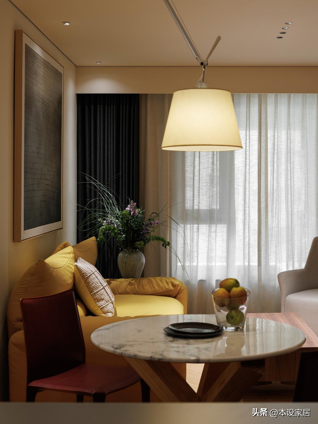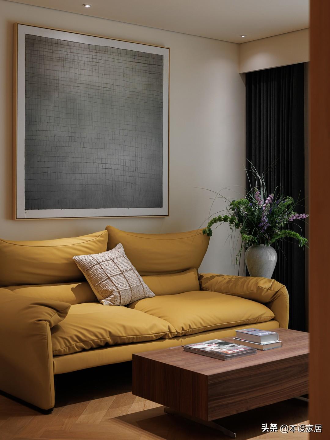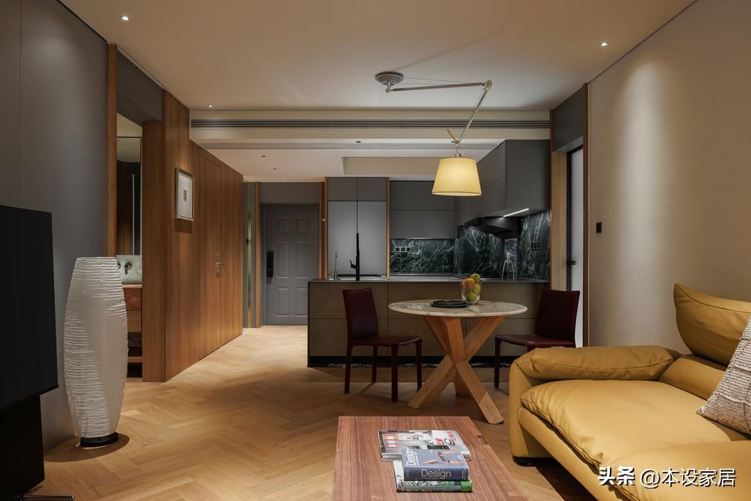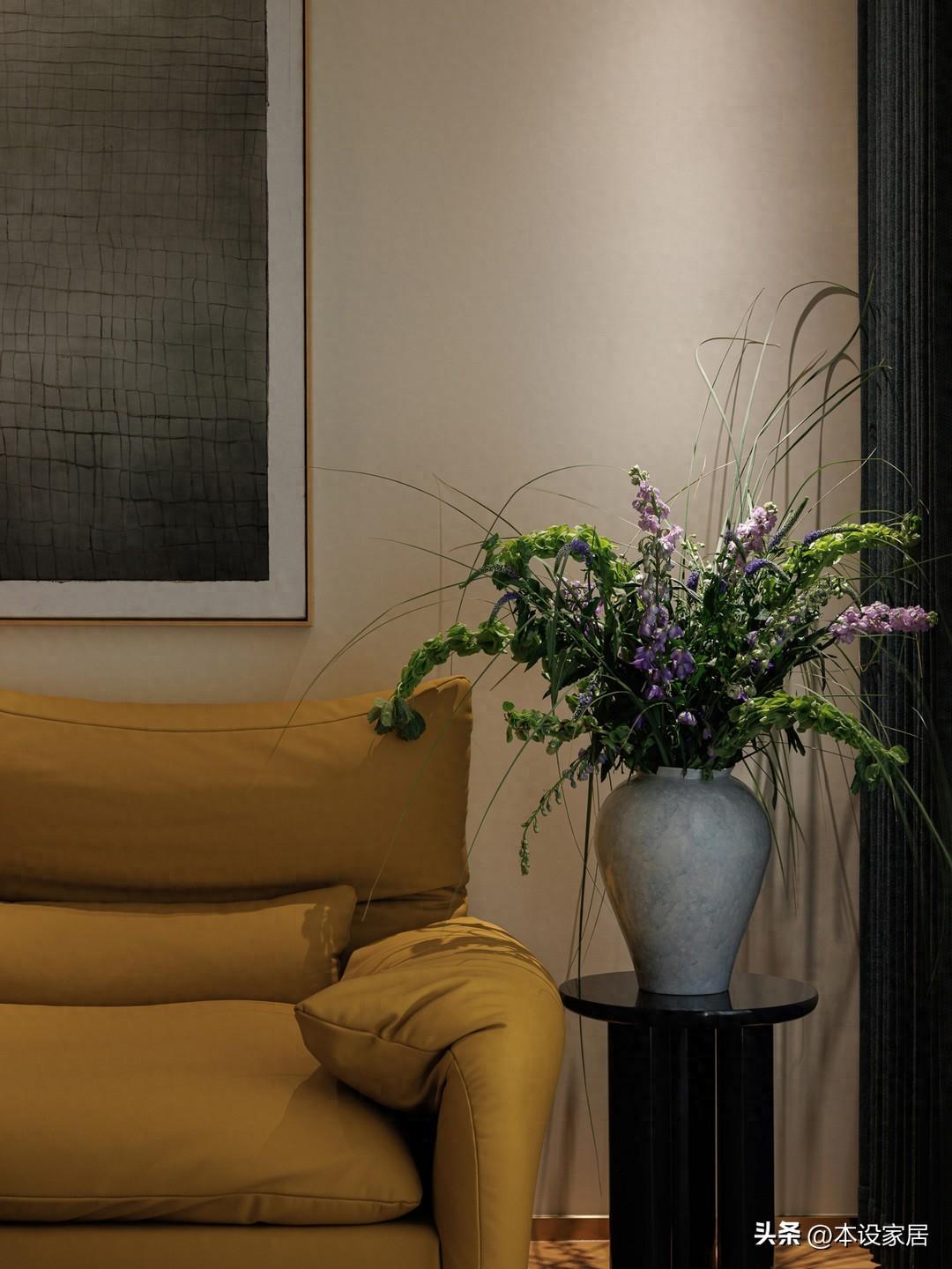 客廳地面滿鋪“人字拼”木地板,牆面是米白色和淺灰色的碰撞,天花則是更現代的無主燈設計,搭配暖黃色的沙發和極簡裝飾畫,再加上暖燈光的渲染,處處透着一股溫潤雅緻的韻味。