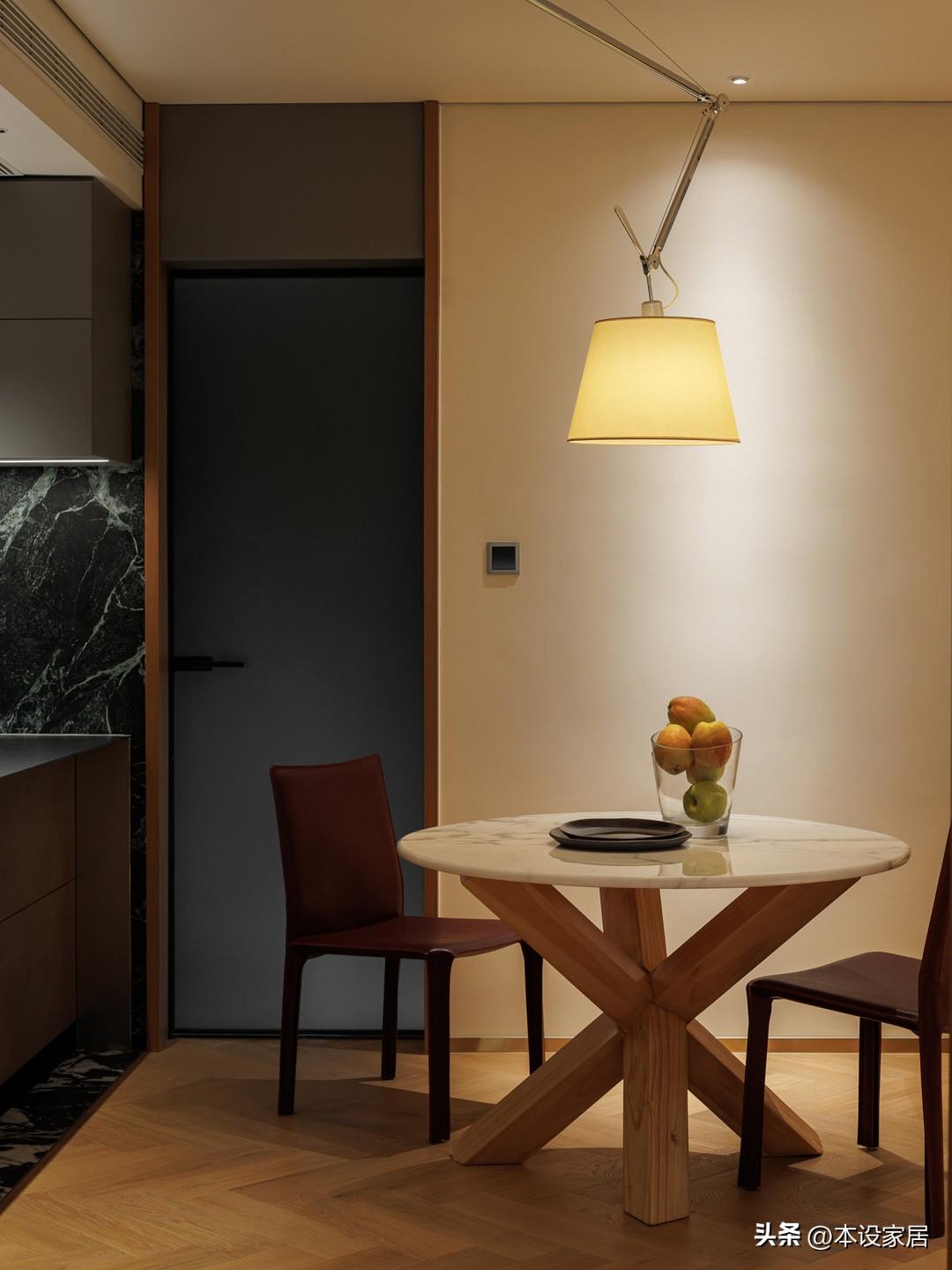 餐廳選用實木+大理石的圓形餐桌,搭配造型簡約的酒紅色餐椅,不多不少,給人一種“出則繁華,入則寧靜”的感覺,放眼望去就是一道美麗的端景,真是賞心悅目。