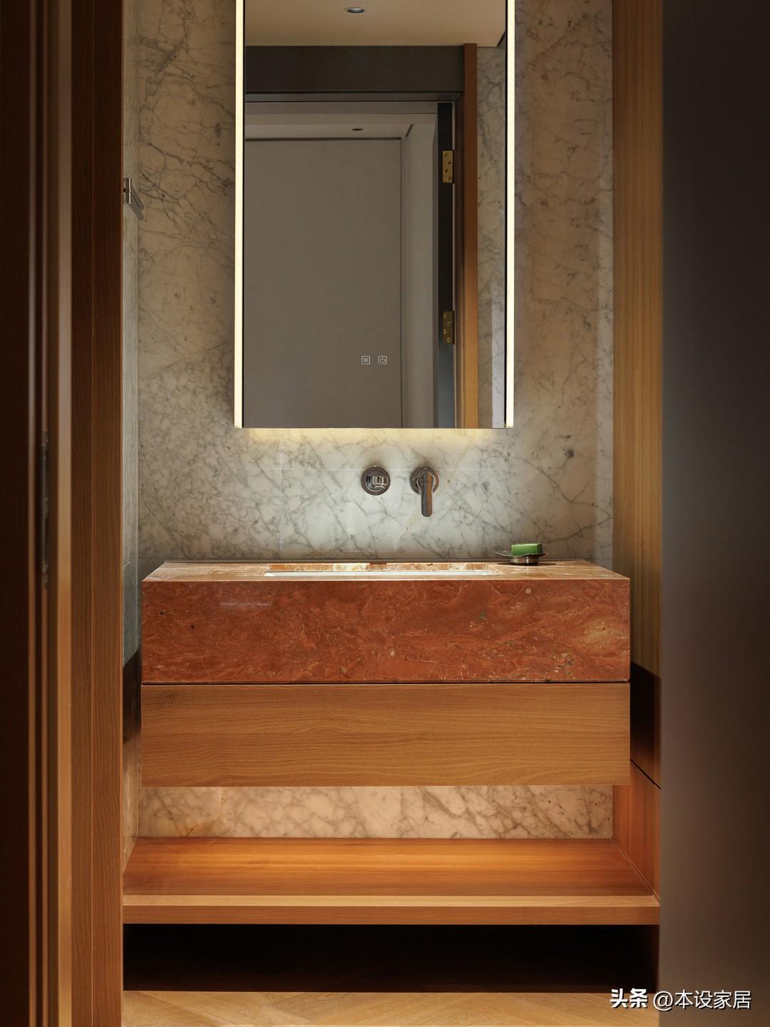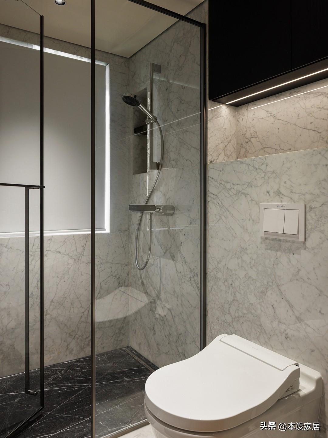 淋浴區和馬桶區以白色色大理石肌理的瓷磚打造,搭配玻璃隔斷,通透、清爽、利落。