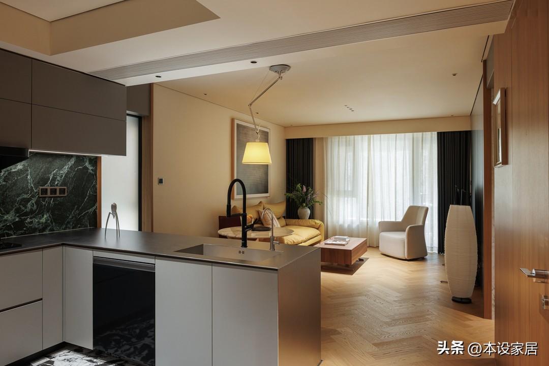 U型的開放式廚房提供了更多的收納空間,嵌入式安裝實用的廚房電器,洗-切-炒動線也很流暢。